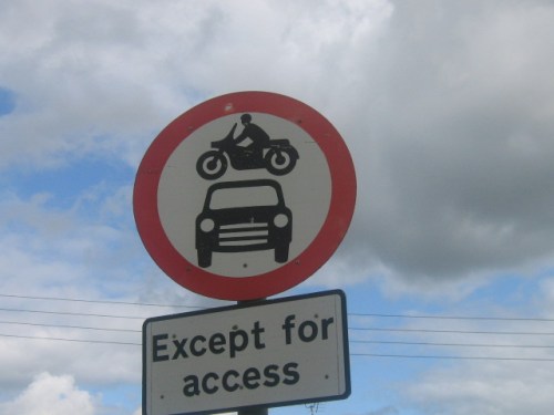 What do you think this one means? Motorcycles should only jump over cars in order to get access to this road?
