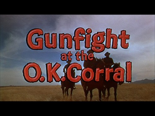 There have been many movies made about the O.K. Corral–most of them dreadful. When I was little I was a big fan of 1957’s Gunfight at the O.K. Corral with Burt Lancaster and Kirk Douglas, directed by John Sturges and featuring a screenplay written by novelist Leon Uris–mostly because of the terrific theme song by Dimitri Tiomkin. The song holds up, but the movie does not! It is enjoyable on a certain level, when you are in the nostalgic mood for a 1950s western, but Burt Lancaster is unusually wooden in his depiction of Earp as a puritanical good guy. Kirk Douglas, on the other hand, chews the scenery in his over-the-top portrayal of Doc Holliday, but I love the scene where he attempts to beat the truth out of his girlfriend, Jo Van Fleet, and has to stop due to a coughing attack. And he gave this family a famous and oft-quoted line: “Was it Riiingo?!”