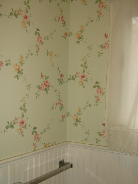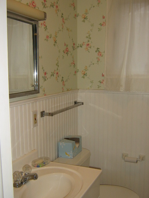 Since the bathroom is so tiny, it’s practically impossible to take a good picture, but you can sort of get the idea. There’s white bead board wainscoting on the bottom half of the wall, white fixtures, and a light faux stone tile floor. The photos don’t quite capture the color of the paper because of the light coming in the window and the flash.