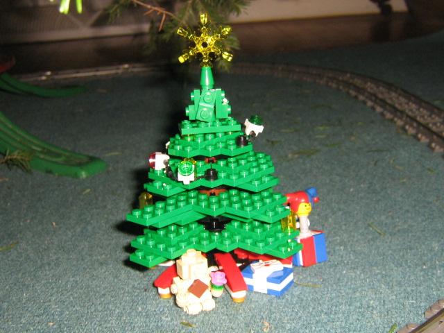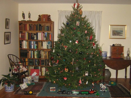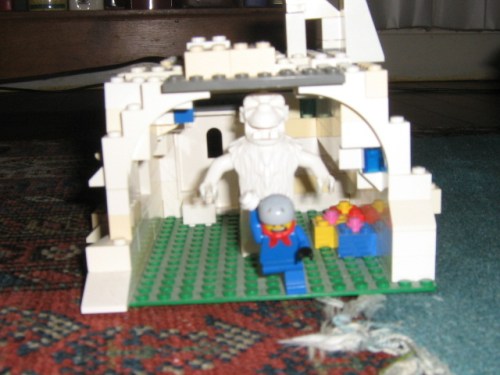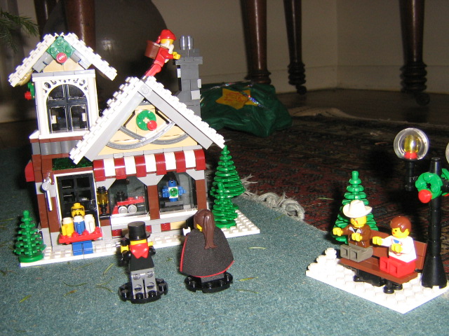 Well, now that the grades are in all I have to do is finish shopping, wrap presents, send cards, and cook — all of which I’m going to enjoy. For starters here’s our tree. It’s very large and pretty. One of the benefits of living in the north country is that we get beautiful, fresh Christmas trees at an excellent price from Canada (I don’t want to make anyone jealous by actually mentioning numbers so I’ll be tactfully vague. Perhaps Canadian trees aren’t subject to Obama’s Christmas tree tax; hence the lower price. But does buying a foreign tree make me unpatriotic?). I couldn’t get a good photo that showed the lights to advantage, but you get the idea. Note also the lego train and attendant buildings under the tree. According to family tradition, the boys build a village of lego around the train. Some of it’s very clever and funny like this little guy holding a snowball and fleeing a mean yeti. You should see the look on the mini-figs face!