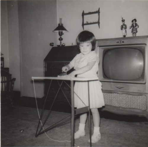 How politically incorrect is this photo? What would Betty Friedan (who spoke at one dual personality’s graduation) think? Well, this dual personality never ironed her husband’s shirts, but then, neither did her mother. But circa 1961, she enjoyed ironing handkerchiefs and doll paraphernalia.