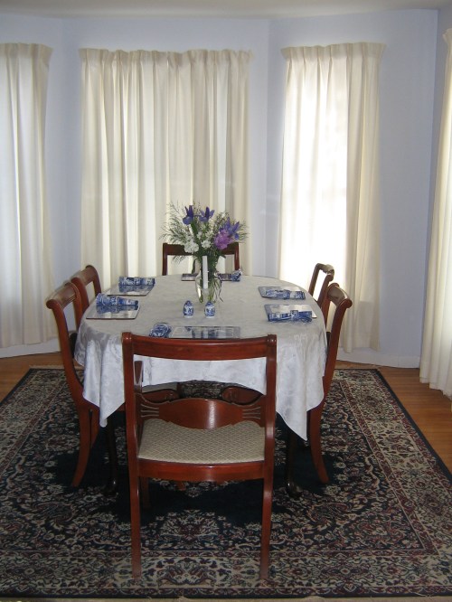 Last summer, I painted our dining room blue and I’ve been meaning to upload pics since then but I was holding out for good ones. It’s quite a small room, but what I particularly like about it is the way the light plays on the walls, creating different hews throughout the day. I’ve tried taking photos at different times of day, from different angles, with and without the flash, and have so far been completely incapable of doing it justice. You’ll just have to take my word for it that the color is subtle and does not overpower the room at all. Despite its not being photogenic, I love my dining room — all it needs now is a red oriental rug (I’m looking) which I think would complement the walls better than the dark blue.