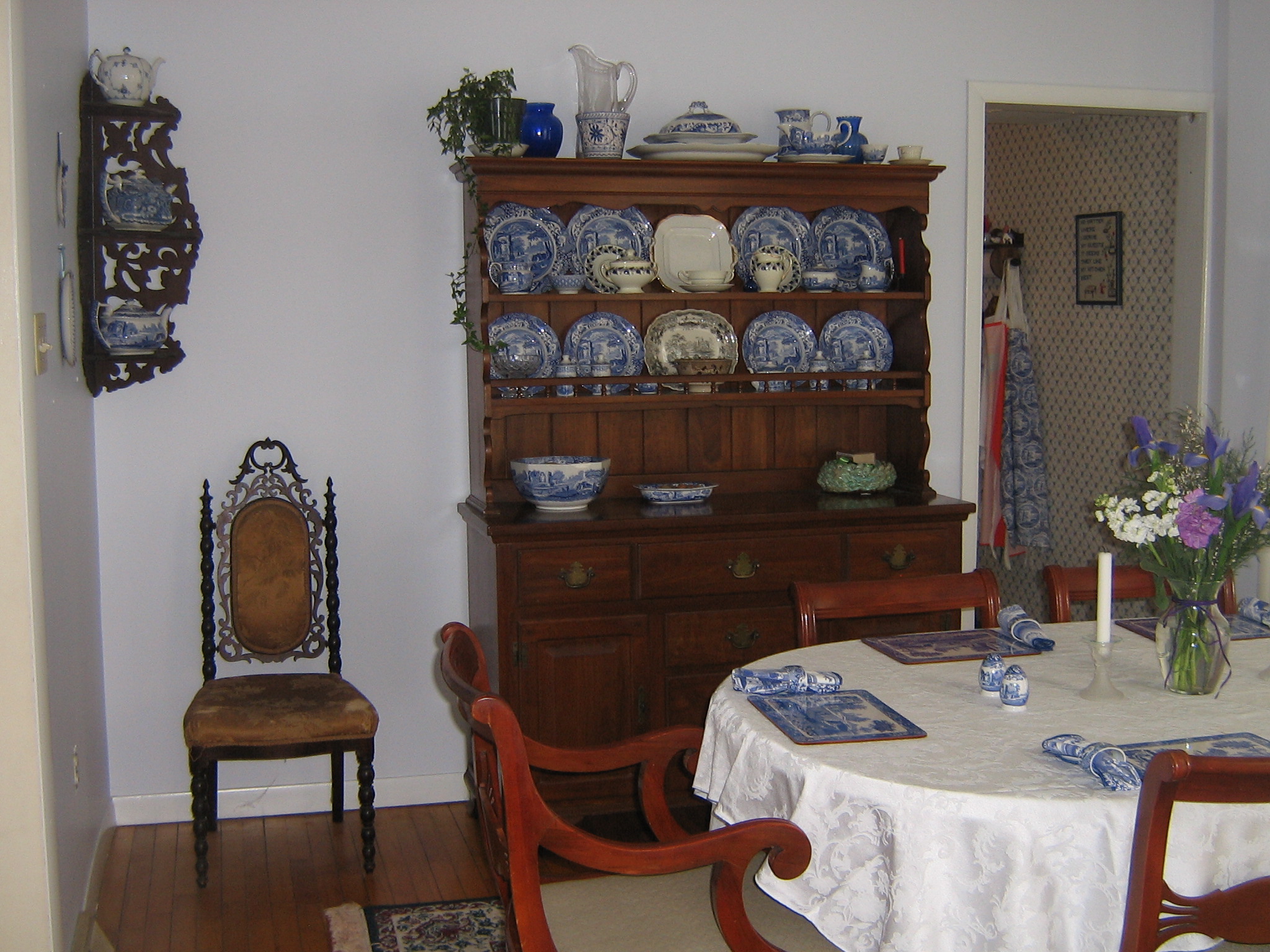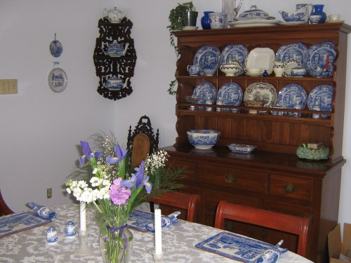 I love china and like to have out a mix of new (mostly Spode, thanks to my mother-in-law, Pam!) and family antiques. Another gift from my mother-in-law, the solid cherry, 1960s vintage Harden hutch we won at a local auction years ago. The table and chairs, also cherry, are 60s and 40s respectively. There’s a lot to be said for furniture of that vintage — although not antique, it’s much better made than anything you can find in furniture stores today. The (unmatched) Hitchcock style chair in the back right of the picture is from my grandmother Cameron’s house.