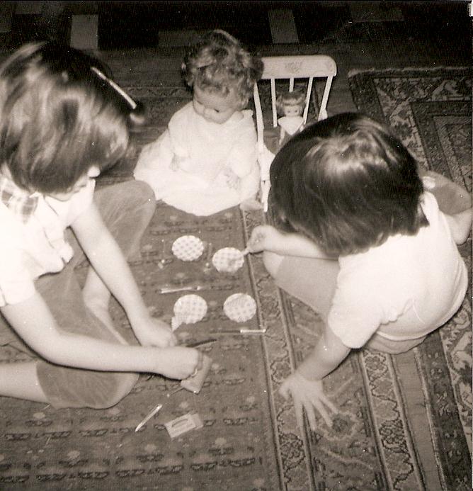 I always wondered if someone took this picture to document the (one) time we played nicely together, or maybe it was just that we had such clean, shiny hair. Dual personality, is that a barrette in your hair? I believe this picture was taken just before Cream Puff (pictured next to the rocking chair) suffered the knife attack. And just to be clear…neither of US did it.