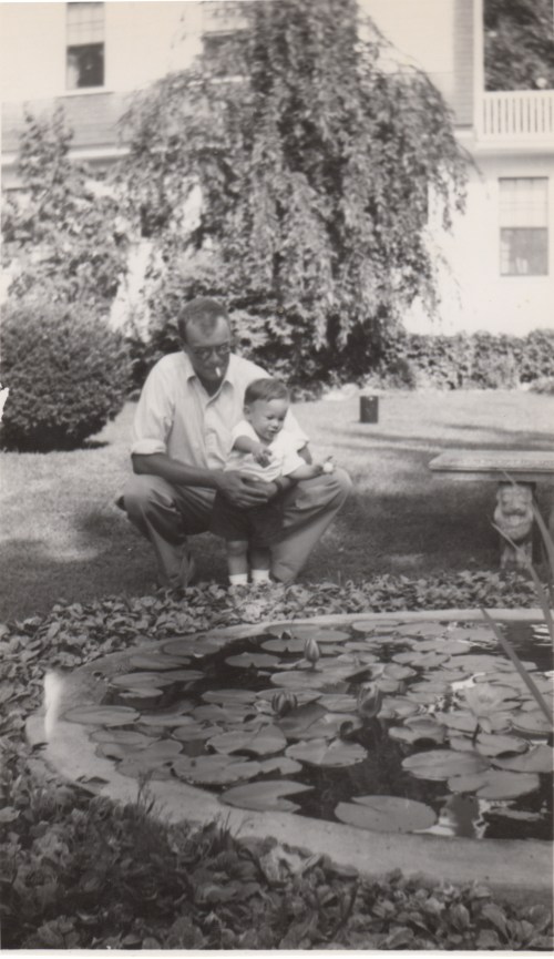 My father was very old school. He carried a Dunhill lighter and wore a fedora and a Burberry Balmacan raincoat. He wore Brooks Brothers suits; two for summer (one khaki and one olive green–a color they no longer seem to carry) and two for winter (gray). He wore Brooks Brothers button-down shirts (14 1/2/32) and shoes. Even in our hot, muggy flyover summers, he never wore sportshirts. (Sometimes he rolled his sleeves.) Jazzy for him meant madras. He wore boxers. He never changed the style of eyewear he wore. Ever. (See above in 1952 with my brother Chris in our grandparents backyard.)