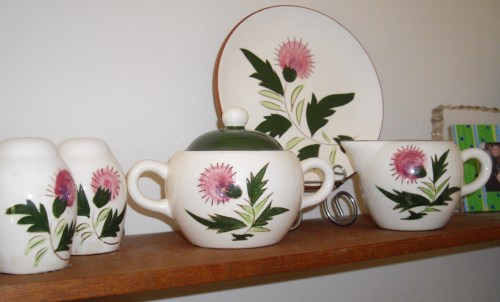 I also have given her some Stangl china in the “Thistle” pattern–very mid-century modern.