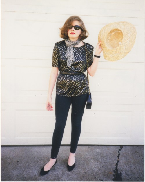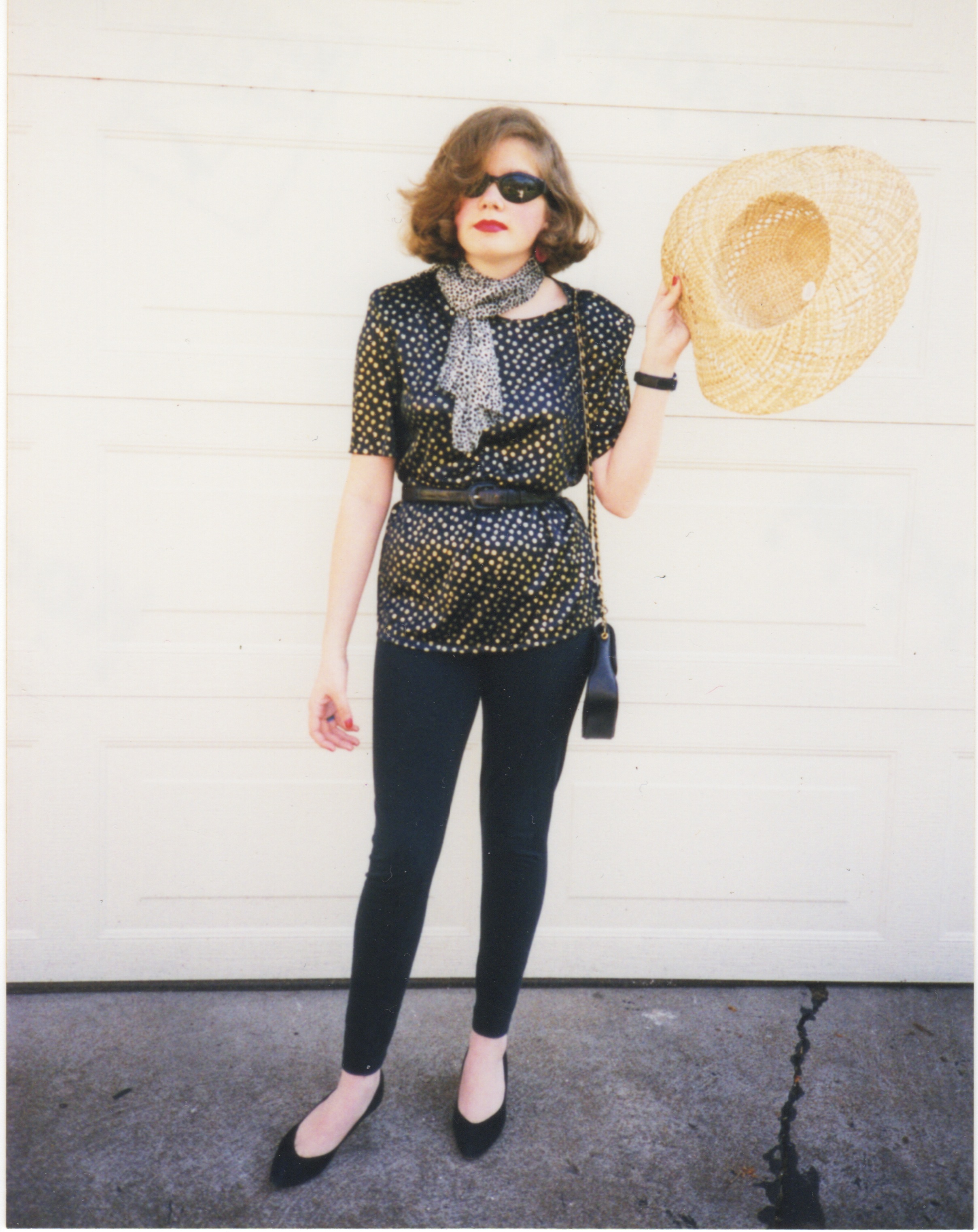 Recently I came upon this classic of daughter #1 on her way to a youth group “mystery” party at church when she was in middle school. She was all dressed up to play some part (femme fatale?).