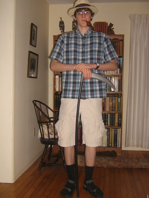 Death (English style) takes a holiday. Note the hat, pipe, and sandals with socks.
