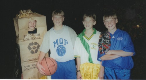 Clearly the boy did not get the memo about the guys wearing their soccer or basketball uniform as a Halloween costume in the seventh grade. No, someone forgot to give him the message. He’s the nerd on the left dressed as a bag of leaves. (Not that you were really a nerd. No way. They were the nerds!)