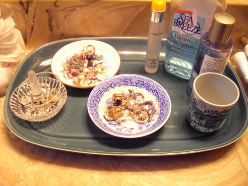 In addition to loving and living with the things I have inherited, I enjoy going to estate sales and looking at other people’s things and occasionally picking up nice vintage items for very little–like this mid-century Russel Wright green tray I got a few weeks ago. I have re-purposed it for use in my bathroom.
