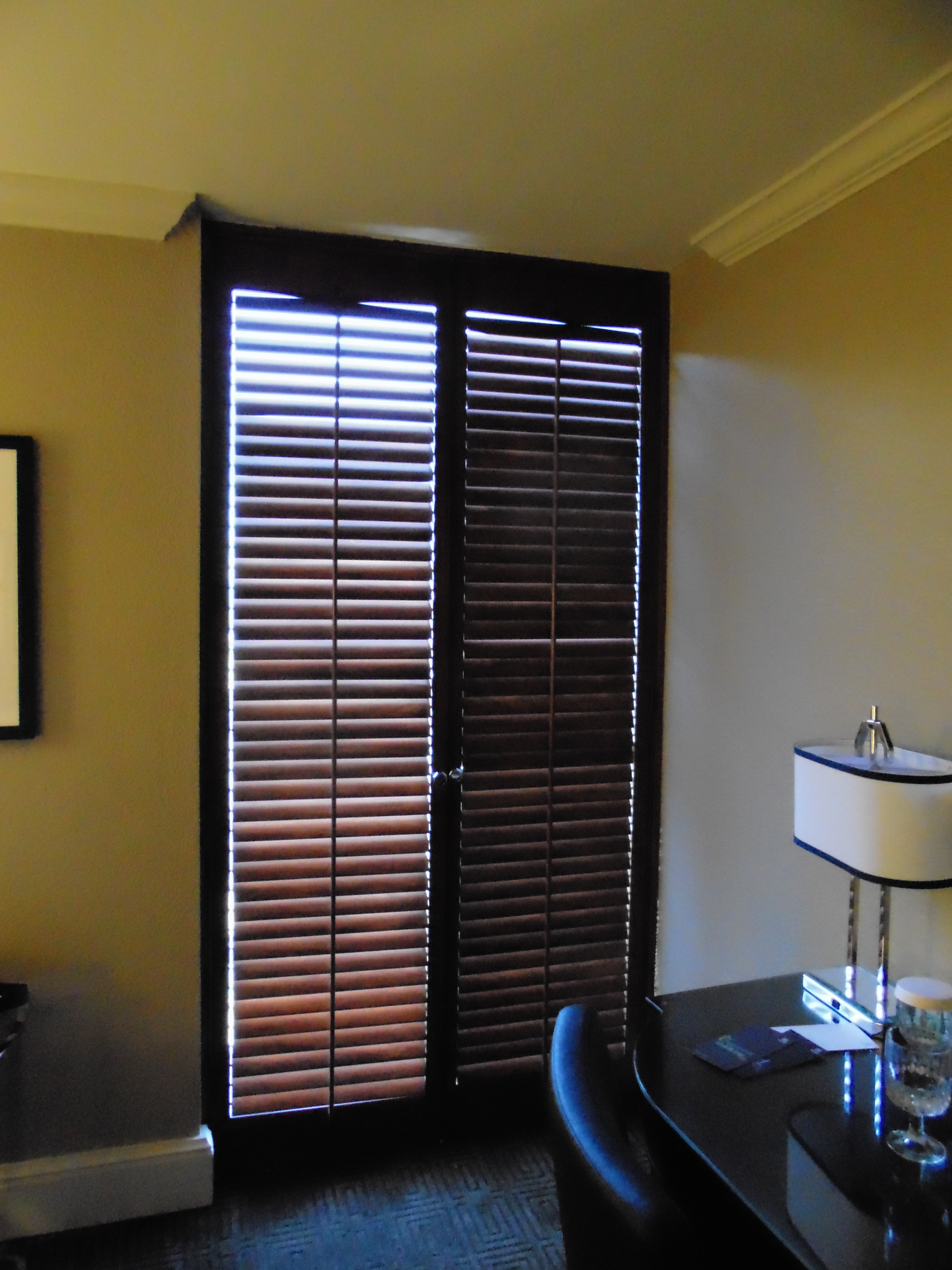 After shockingly pleasant interludes at airports (including JFK!) and on planes, I arrived in New Orleans, where the temperature is in the mid to upper 60s (perfect!) and if one sticks to the main drags (e.g. the three blocks of Canal street by the hotel and a couple of blocks of Bourbon) it seems reasonably charming. My hotel room is comfortably standard in every respect except this window, which looks deceptively normal with the shutters closed