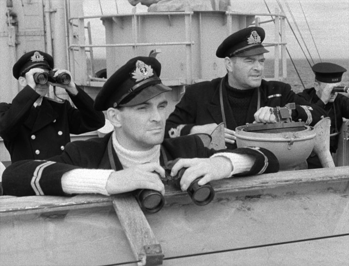 If you can’t find a copy of the book, the 1953 film version is quite good, too. It stars Jack Hawkins, Donald Sinden, Denholm Elliot, and a young Stanley Baker (as the crass, cruel officer). If I remember correctly the above film still shows Donald Sinden and Jack Hawkins trying to decide whether to pick up drowning sailors or drop depth charges to catch a U-boat and thus kill their own guys — horrible dilemma but no one cried about it.