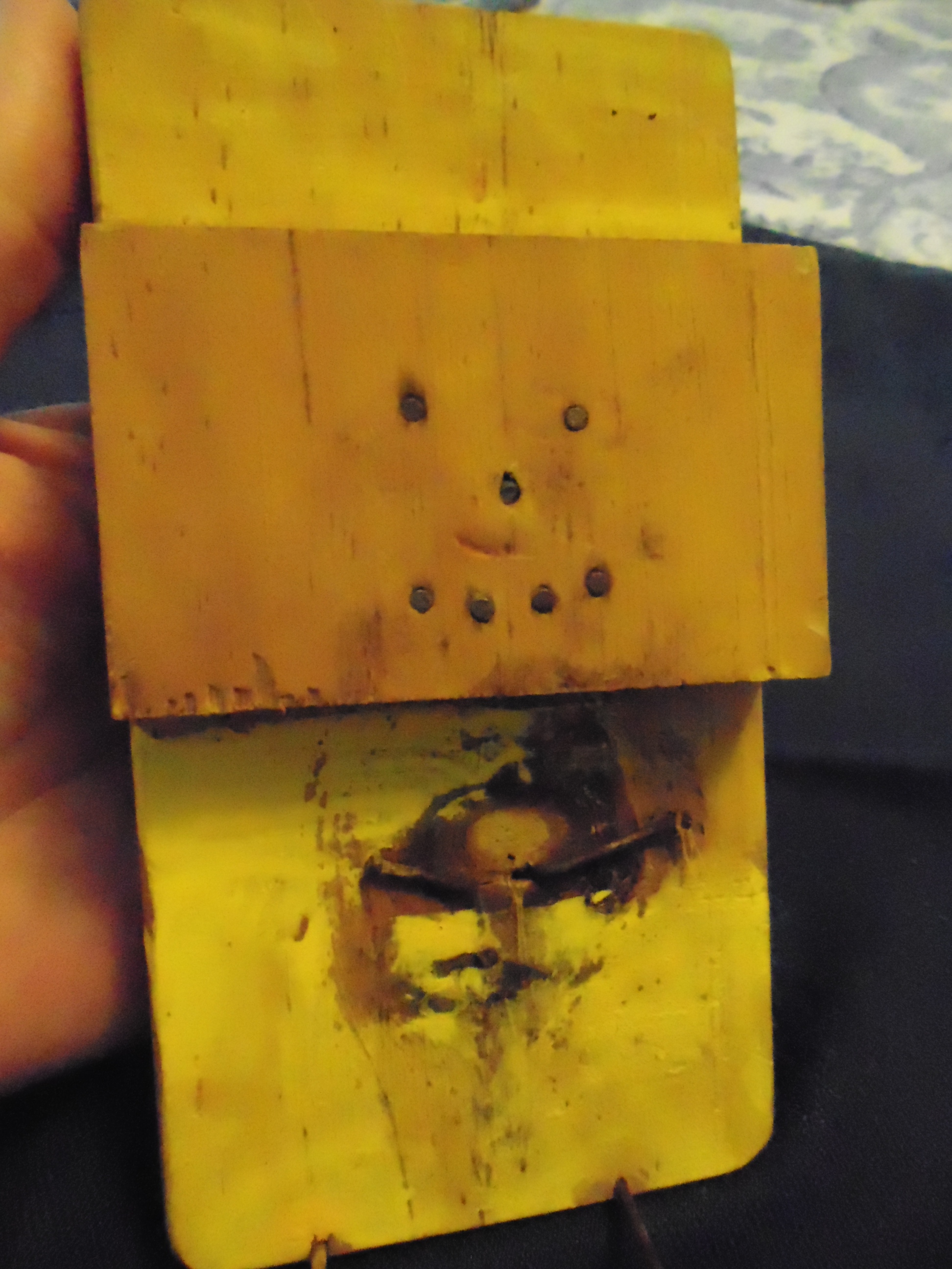 And this wooden ‘figure’ that I made in my Grandpa Cameron’s workshop when I was a small child (five or six?) and painted yellow at some later date. Note the rounded corners that I spent ages sandpapering to perfection and the happy smile, legs, and folded arms (hard to see in the middle of the pic) made of nails.