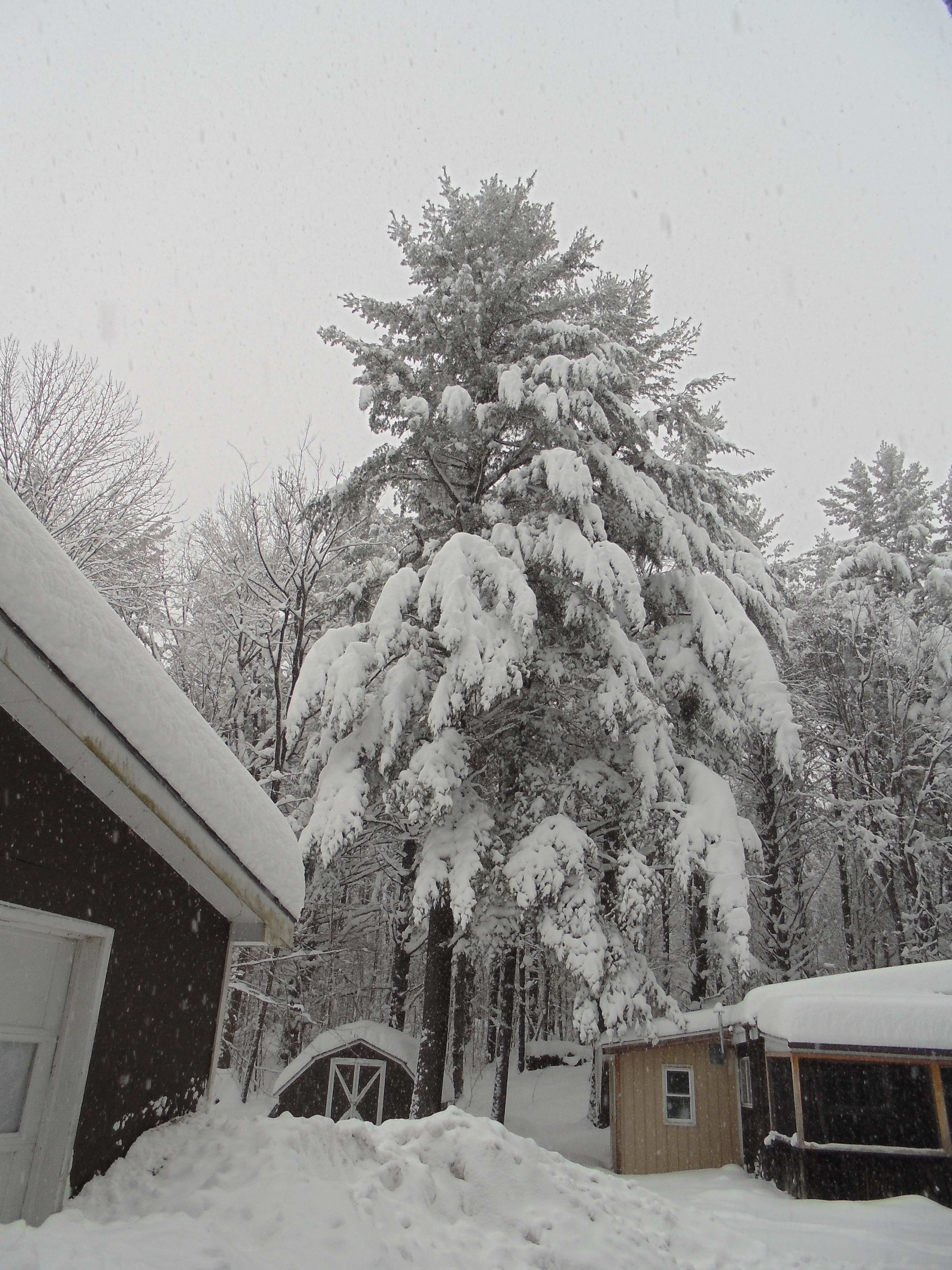 After that, for a wild change of pace, we loaded up the car with our three pumpkins and several gourds and drove out the the camp to shoot ’em up. Alas, I forgot the camera so you will just have to use your imaginations. Suffice it to say that frozen pumpkins are very fun to shoot. And did I mention that we have snow? The trees looked more or less like this