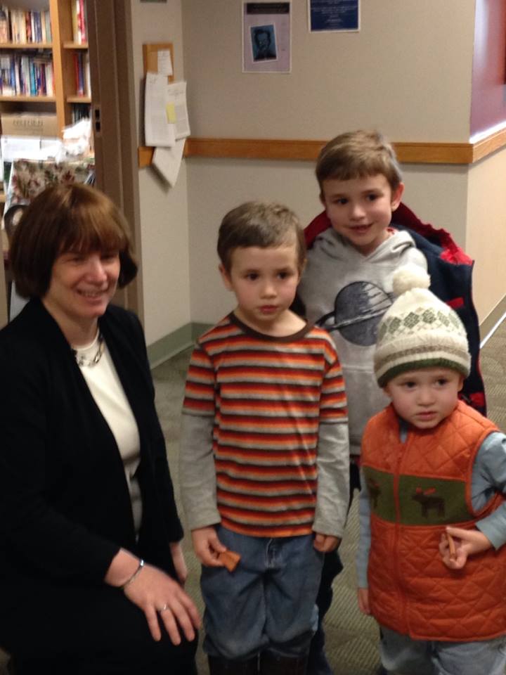 Yesterday, two little boys — sons of friends from church — visited me at my office to see its treasures and learn about ancient languages. When their parents and little brother picked them up someone took a picture.