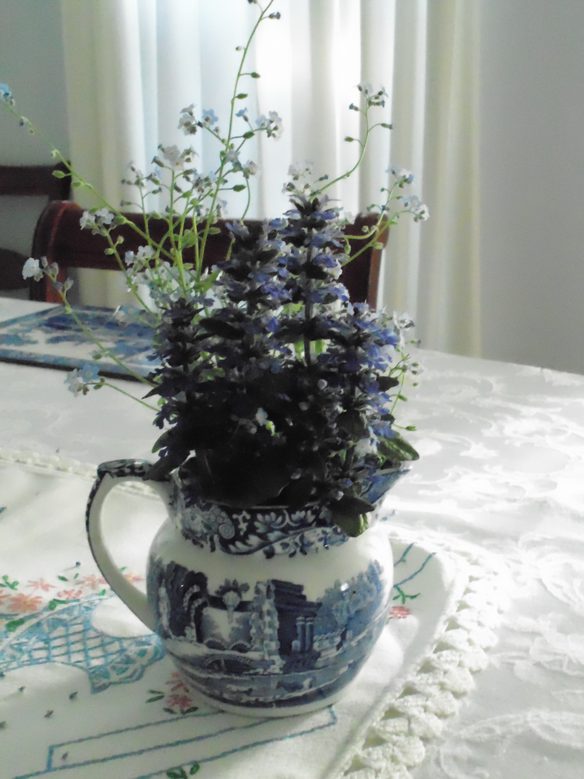 …a glorious day in fact. Til is hiding behind my hosta (I think he’s embarrassed by the weeds and grass) and the flowers are blooming outside
