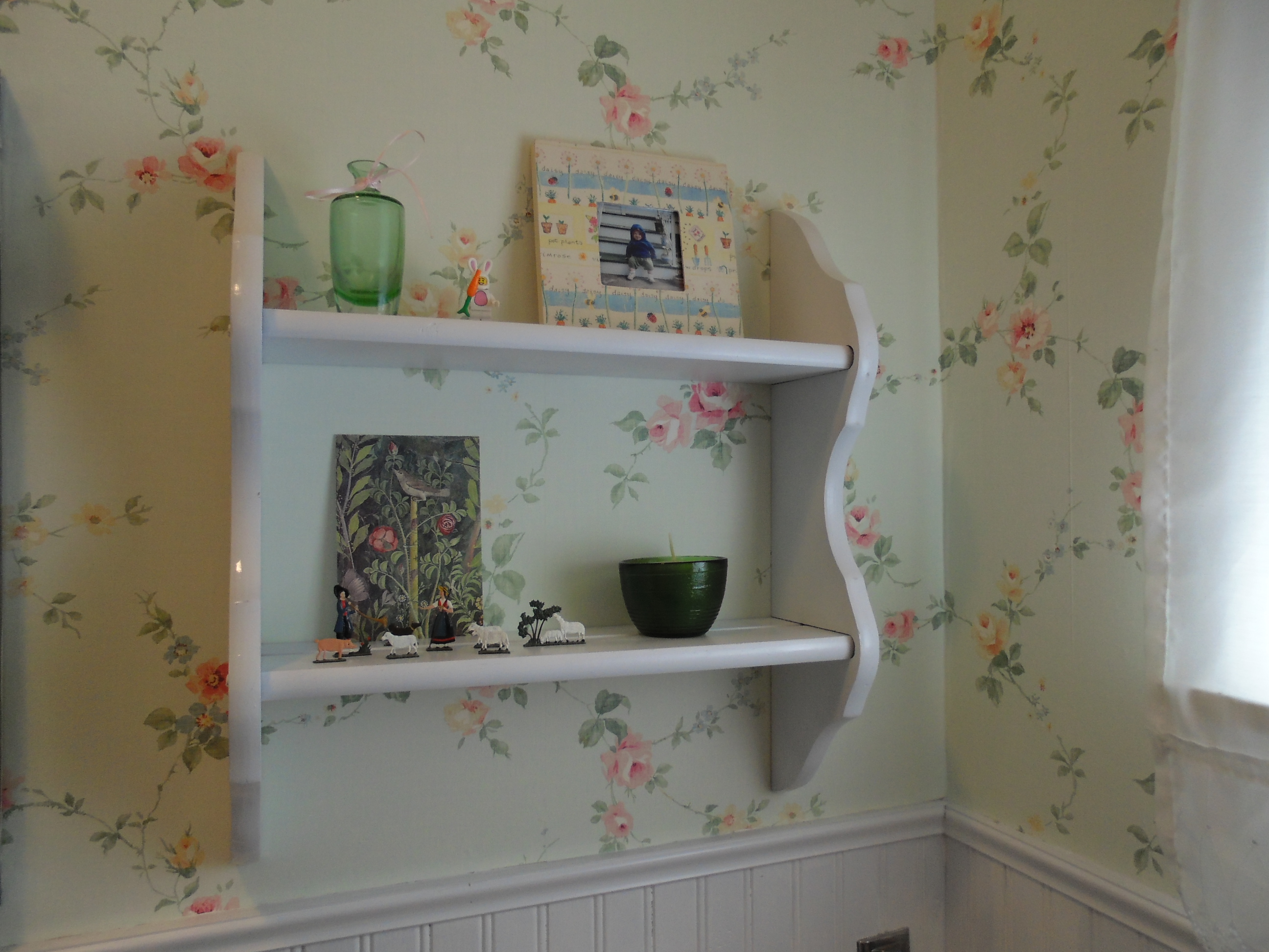 I haven’t quite settled on what will be on the shelves, but it’s a start. The little, flat metal figures are Little Boy Blue and Little Bo Peep, their sheep, a dog, and a pig (I’m not sure what role the pig is supposed to play, but it’s cute). I’ve had these little figures since I was a kid and recently rediscovered them while doing some ‘attic excavation’. I like them on the shelf. So what do you think?