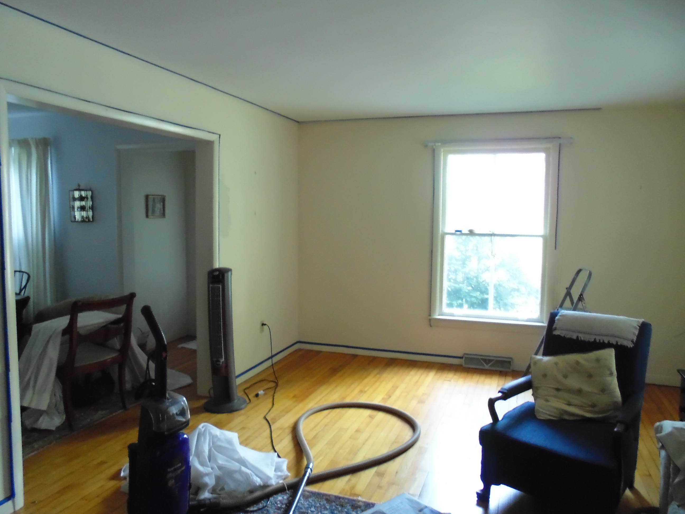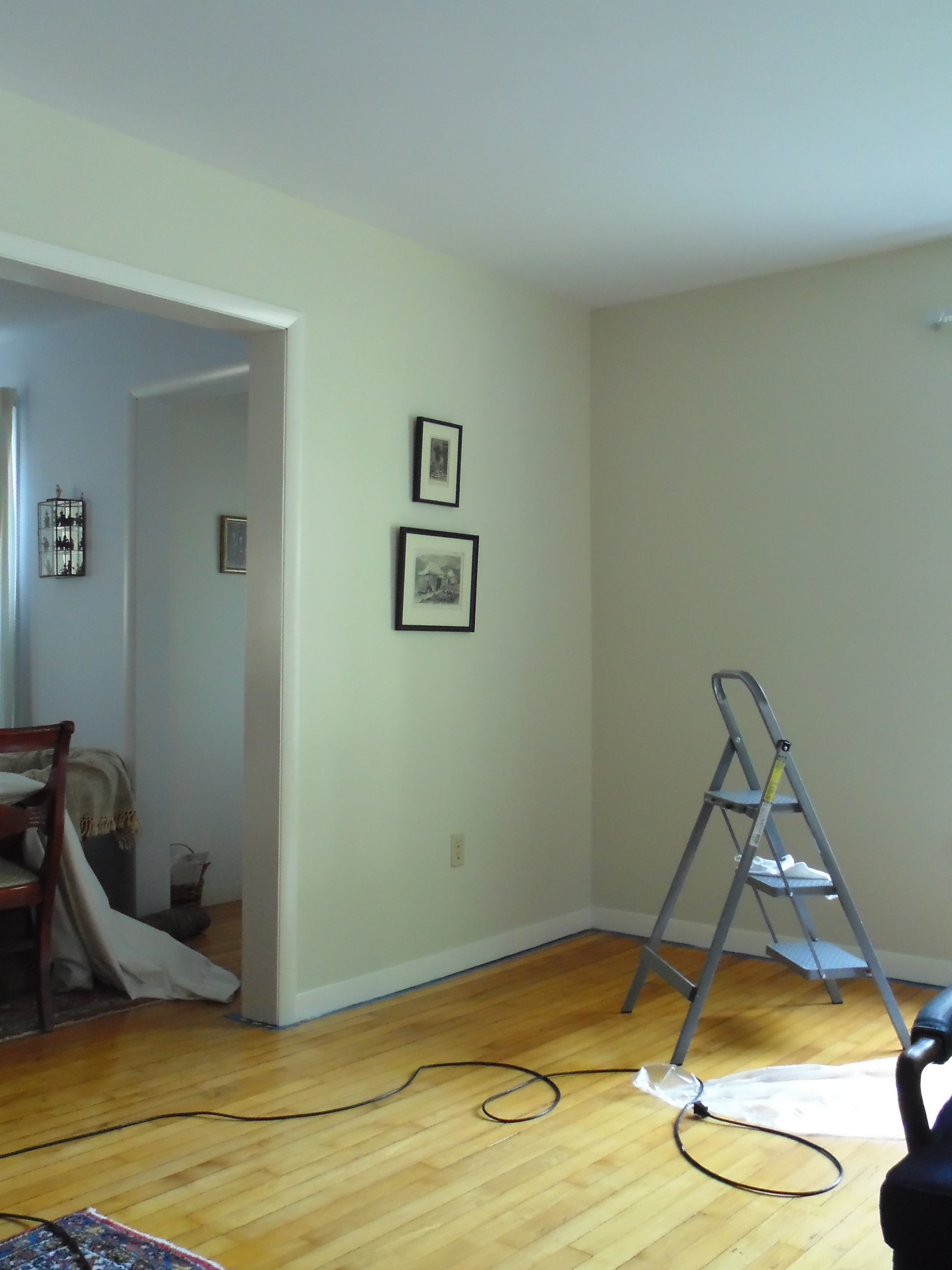 Yes, we’ve been painting. But inn our case, we do it the other way around — I do the detail and he paints. While the DH was away in London Tim and I painted the living room, a fairly monumental task, if I do say so. We did one half at a time. Here’s the first stage of the first half — I’ve taped the edges and we’re ready to go.
