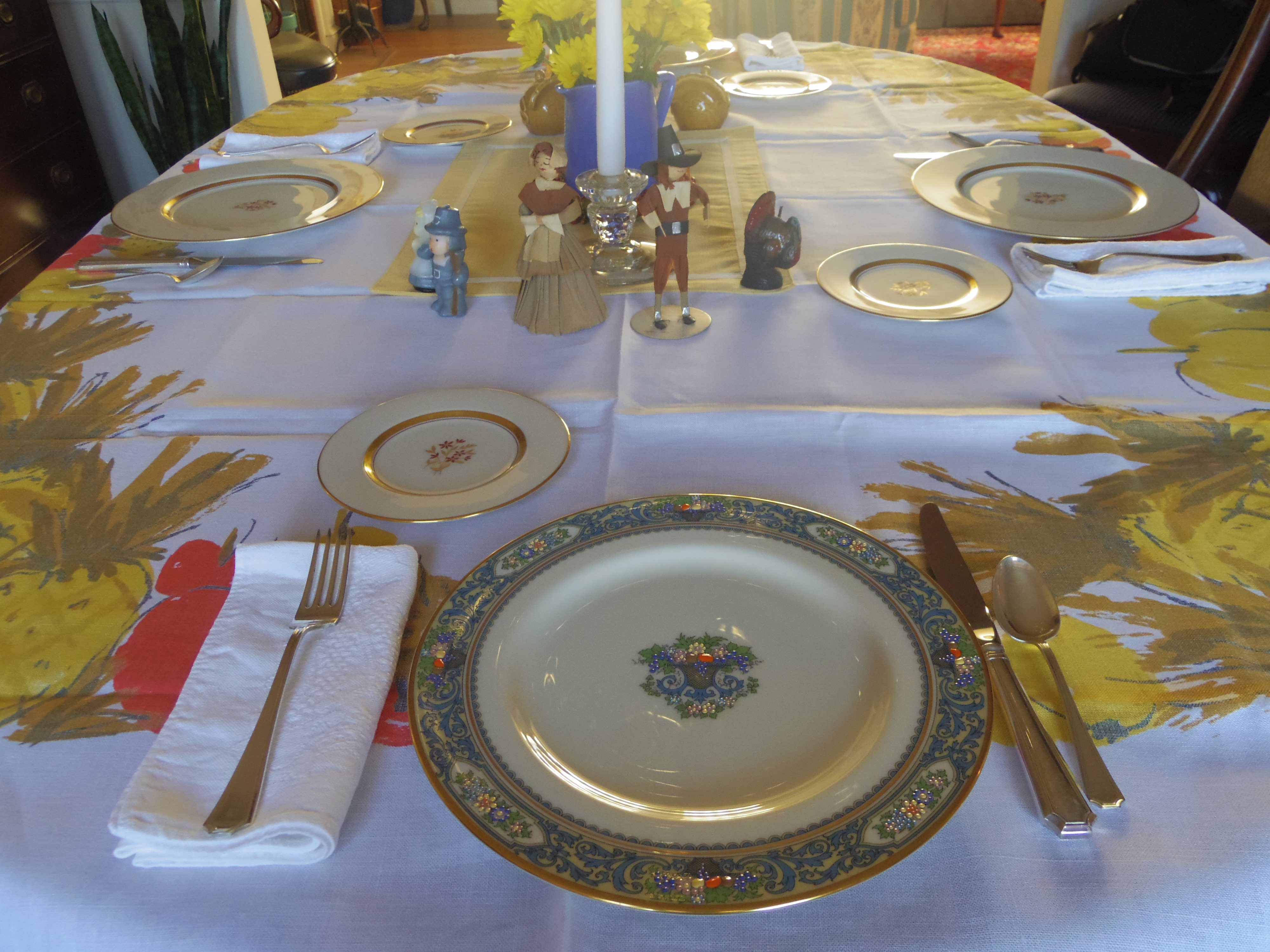 I like to mix up my china, using some of my own fine china pattern (Autumn) and some of my mother’s pattern (Nydia)–both Lenox. And I love this vintage Vera tablecloth! So autumnal.