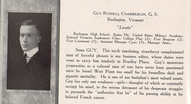 Note that his commanding officer was George S. Patton. You’ll notice some discrepancies between the two stories. The official report says he died instantly (probably true); the other has him shot through the mouth, but still able to utter some last words (probably not true). Who knows? Clearly, Guy’s family felt the need to share these stories with the community. His death certainly convulsed their world: his wife, Dorothy, showed up out of the blue to meet the family; his mother died within months, and his brother (our grandfather), a veteran with a wife and child, never recovered his pre-war joie de vivre. After his mother died, I’m not sure he ever went back to Burlington again. Only the two daughters, Ethel and Carly (but especially Carly), kept the memory of family alive. She must have been the one who sent the stories into the alumni magazine. I wish I could have known them all.