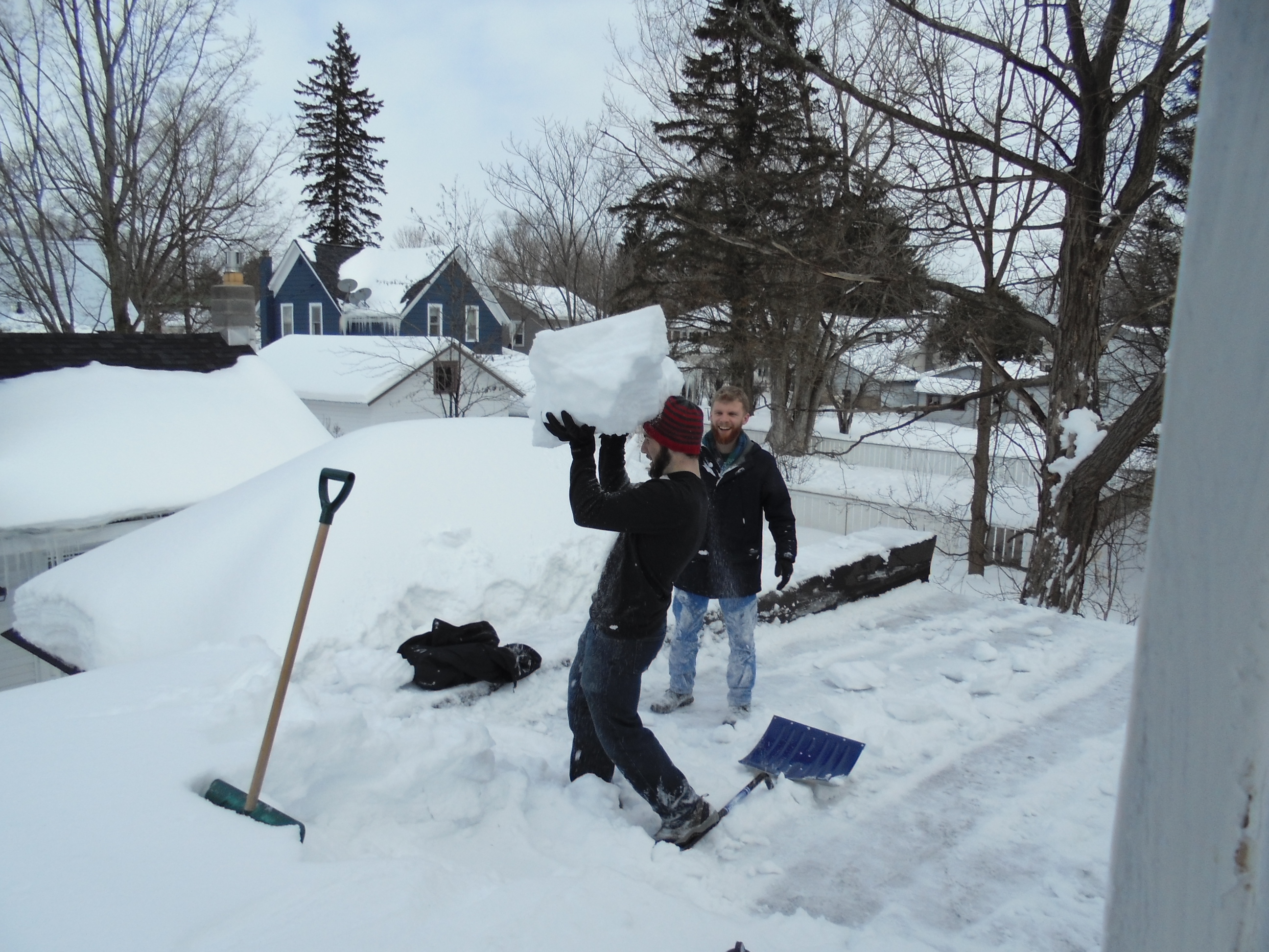 It has been quite a week: so unseasonably cold that the frost line went deeper than the normal five feet and several nearby towns had massive municipal water disasters. Some even resorted to ‘trickle’ orders, hoping that if people kept their water on, the pipes wouldn’t freeze. So far, Canton has escaped, but keep your fingers crossed. Winter isn’t over yet. We did have one day mild enough so that my boys could frolick among the roof tops. Actually, they were not so much frolicking as attempting to prevent the garage roof from caving in.