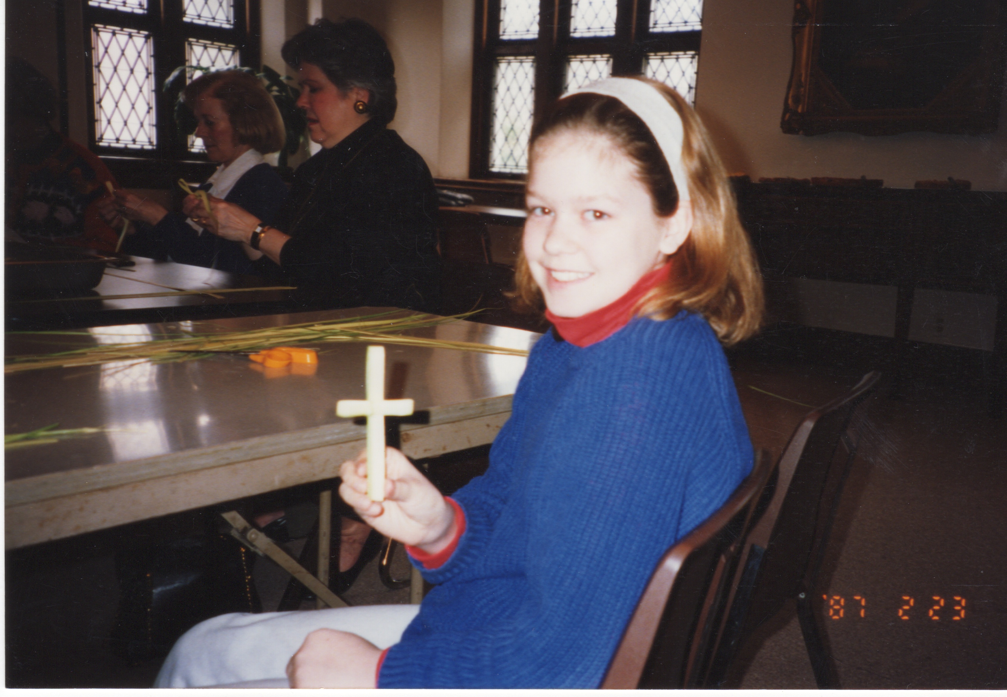 Did I not tell you this would happen? Here is the picture I tore the house apart looking for–daughter #1 making palm crosses in the fifth or sixth grade…I found it on Sunday, sitting peacefully in a shoe box on a shelf…C’est la vie.