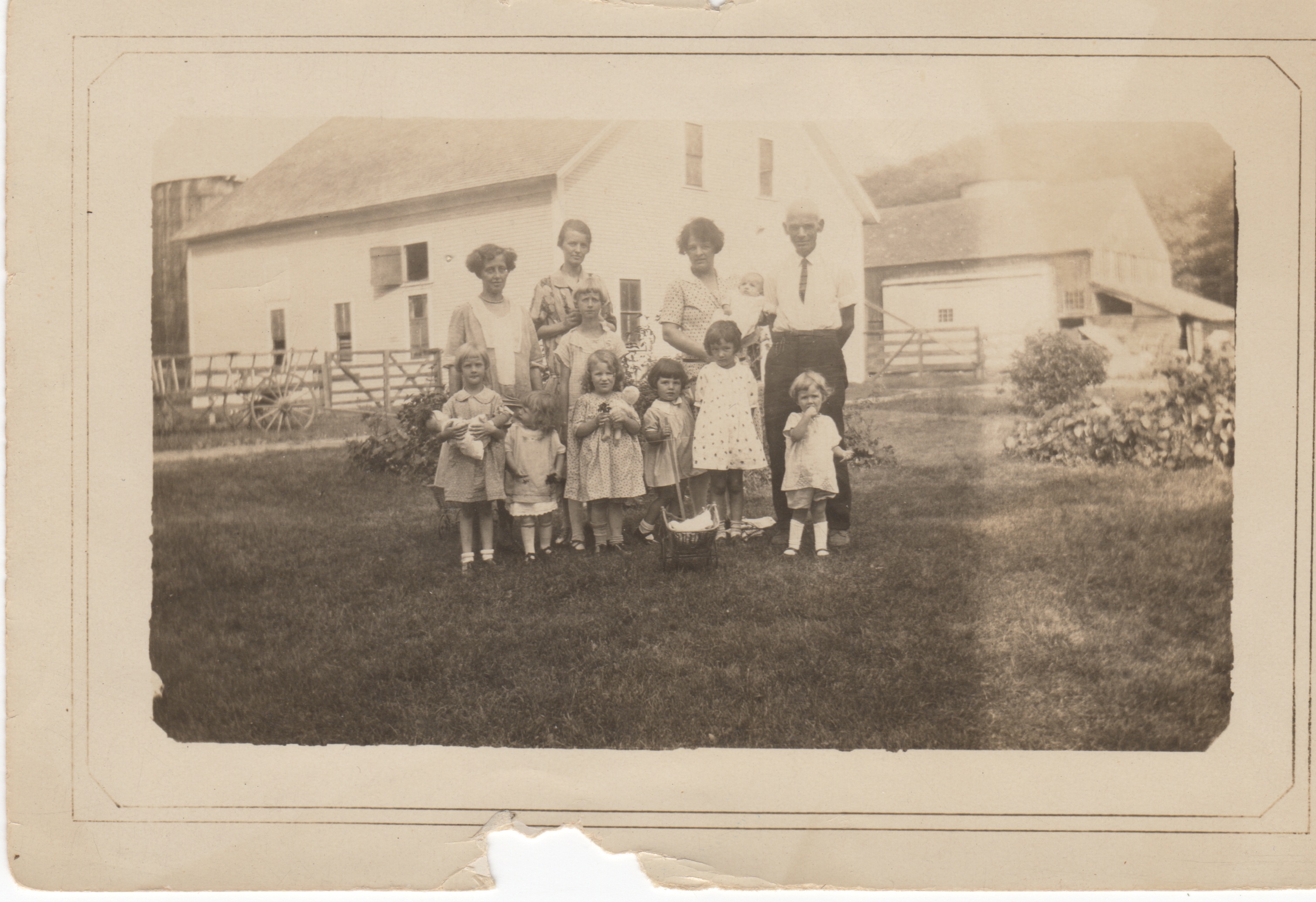 Her mother and grandfather are on the right. They are visiting their relatives (the Wheeler-Rand-Smiths) who owned the farm. My mother is the little dark-haired girl with the baby carriage and her older sister Susanne is to the right. I don’t know whose baby my grandmother is holding, because her youngest daughter was born in 1933 and this must be 1928-29, judging from my mother’s age (3?). The other women and the blonde children are members of the family (the Frohawks) who lived on the farm and farmed it.