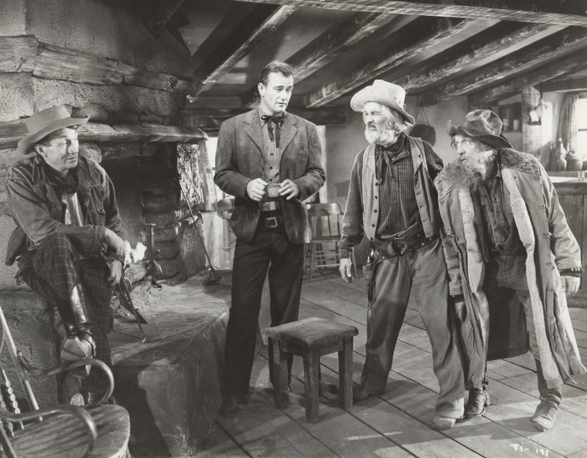 Mr. Wayne has to fight his way through every inch of this film, against toughies like Ward Bond, a crooked judge; Harry Woods, a no-account rustler, and Russell Wade, a weakling gun-happy young rancher. Even Ella Raines sends some bullets whizzing perilously close to our hero’s head … Mr. Wayne walks into a mess of trouble in Red Rock, but in eighty-seven noisy minutes he bowls over the opposition, turns up the murderer of his cousin and has Miss Raines purring in his arms. Just take Tall in the Saddle for what it is, a rousing old-fashioned Western, and you won’t go wrong.