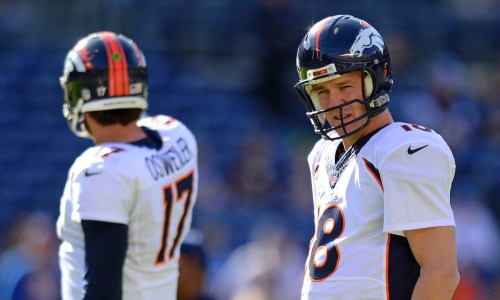 Dec 14, 2014; San Diego, CA, USA; Denver Broncos quarterback Peyton Manning (18) and quarterback Brock Osweiler (17) before the game against the San Diego Chargers at Qualcomm Stadium. Mandatory Credit: Jake Roth-USA TODAY Sports