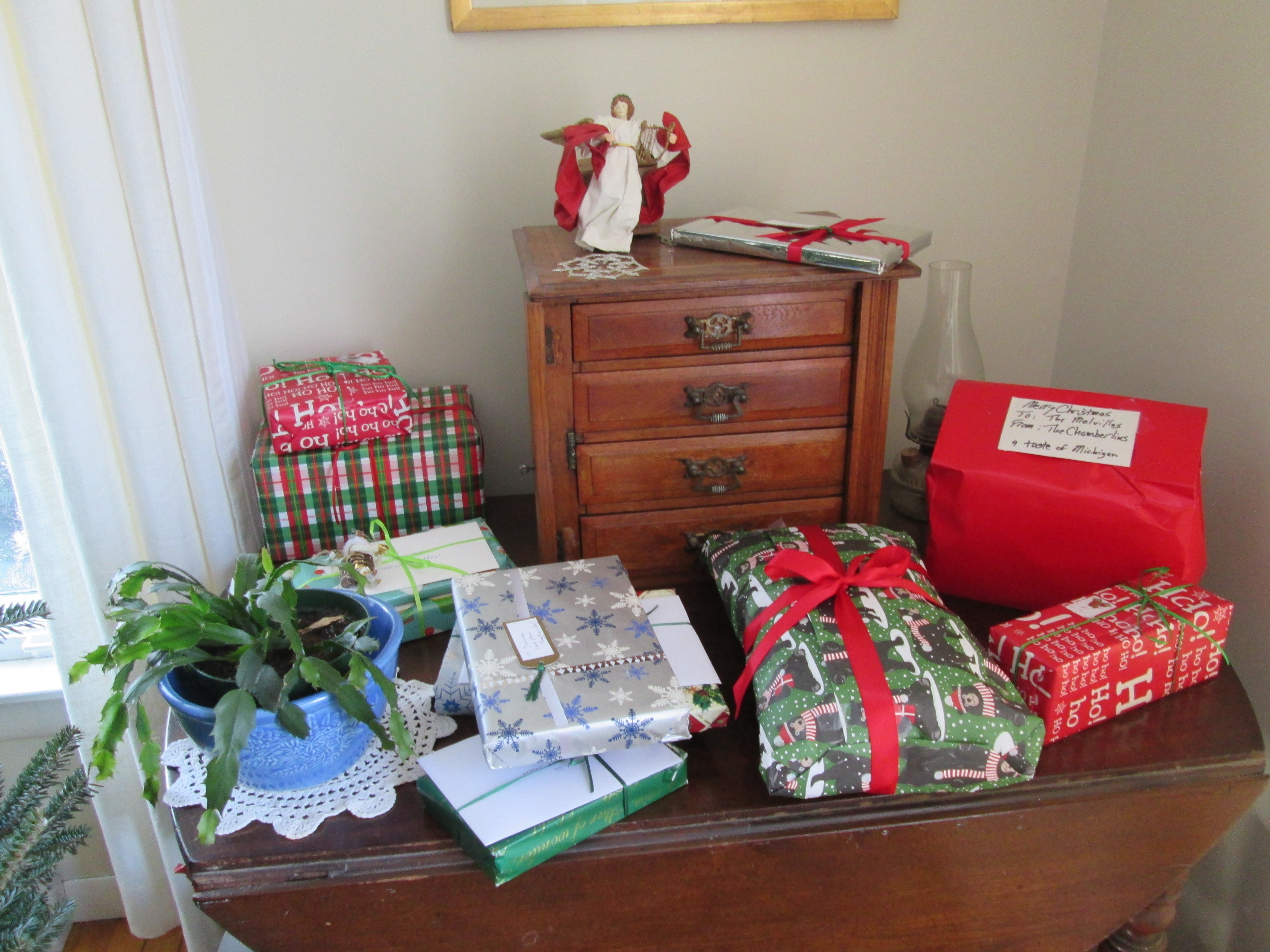 It even has a string of little LED lights to make it twinkle at night. Note, too, the vintage Santa candle that my DP sent to me. Yes, as you can see in the photo’s background, our big tree has been up for a week without lights or decoration, but the presents are accumulating nicely.