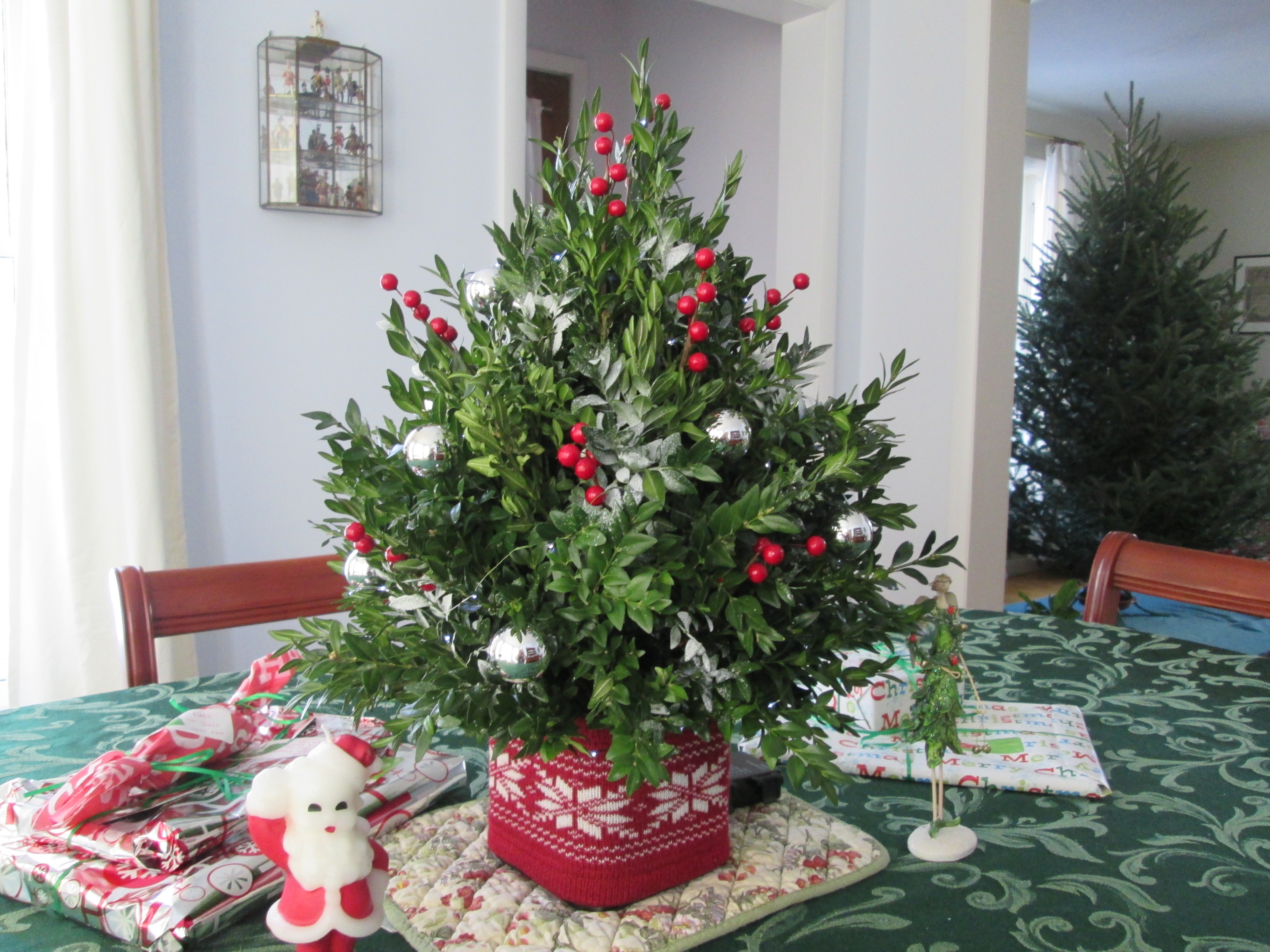 My plan to drive to UPS to send my packages is on hold for the moment, but there’s plenty to do inside, including loads of end-of-semester grading. Still, we’re coming along. I found a perfect little boxwood centerpiece.