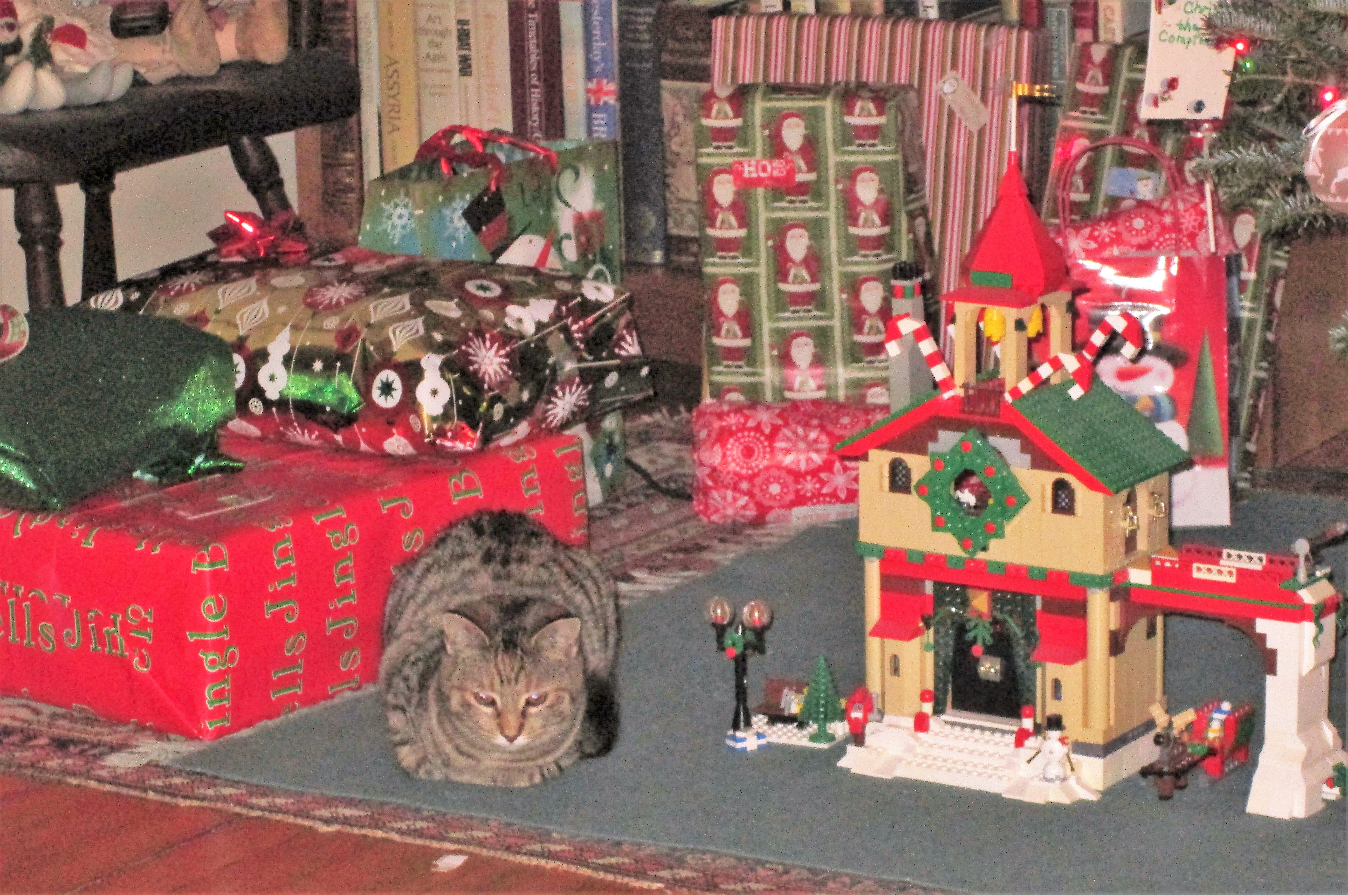She’s not a cuddler or a climber (yet); rather, she’s a hunter, who loves to chase the red dot of a laser pointer all over the house. She’s very fast, but also so coordinated that she doesn’t knock things over — even the Christmas Lego! Being a kitten, however, she gets tired out by all the stimulation and has to take frequent naps.