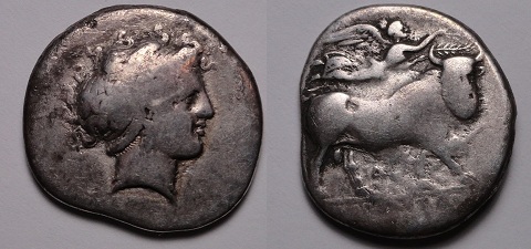 The city minted various versions between about 425 and 275, and mine seems to fall somewhere around 350. To give you some chronological perspective, at that point Rome was just beginning to expand a little, Neapolis was a Greek city, and Alexander the Great was still a child.