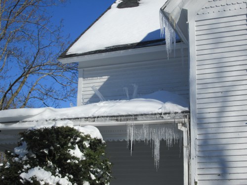 Now we have blue skies, killer icicles (note how some have detached and stabbed the snow),
