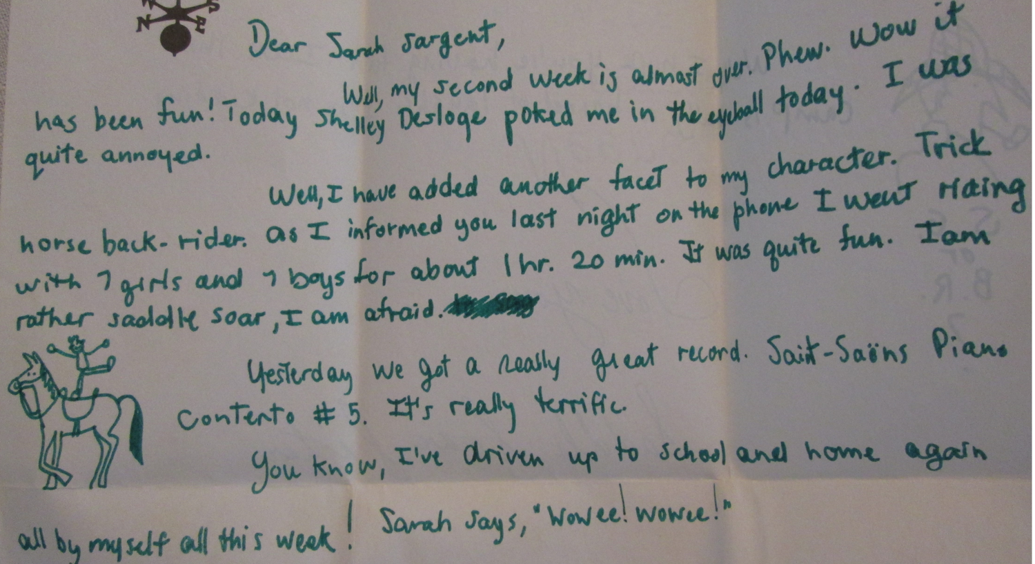 With posterity in mind even as a teenager, I think I kept every letter ever sent to me. In our attic excavation we have uncovered the mother-lode of correspondence, most of it from my college days, but some from that “magic” early 1970s period. The summer before 8th grade I went to visit my aunt Susanne in Massachusetts. It was the first trip I’d ever been on without my immediate family, and it was a long one — I bet I was gone for at least a month. My darling dual personality and I corresponded throughout. She even illustrated her letters — she was quite the artist, don’t you agree? (In case you are wondering, I didn’t tear out the picture. That’s the result of my freeform cut and paste using Paint).