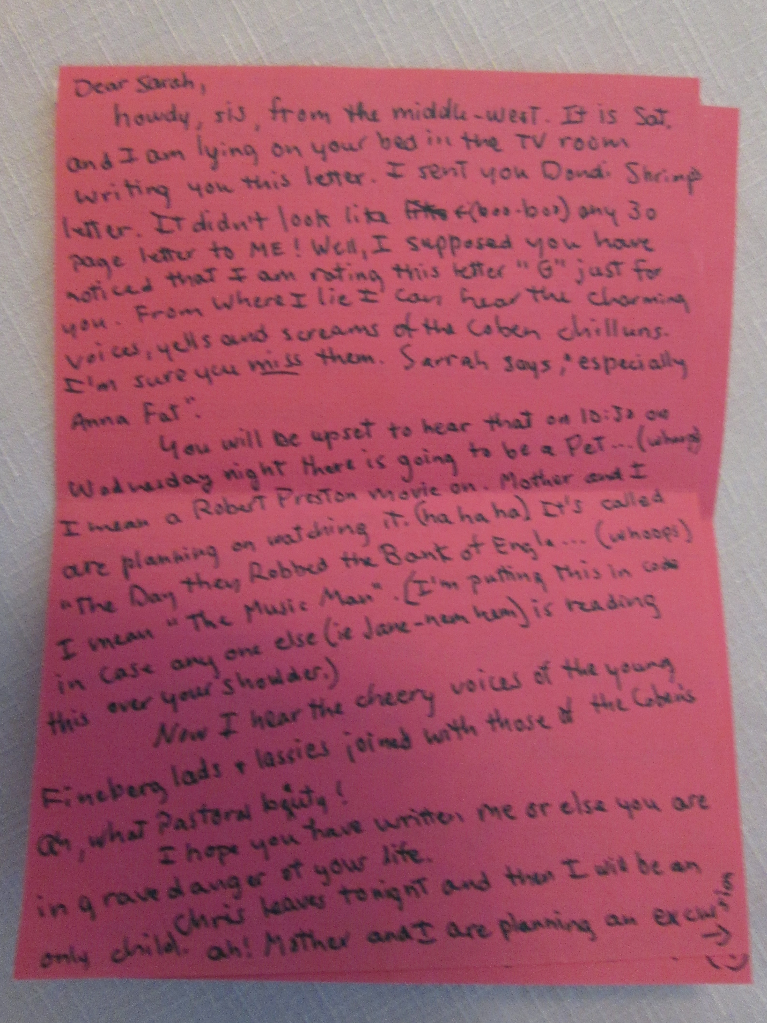 I have spent a happy few days reading all these wonderful missives, as I’m sure you can imagine. Just wait until I post about my college days! But beyond making me laugh out loud and recall past times, I have come away feeling very loved. My parents, siblings, and friends all wrote funny and informative letters exhorting me to work hard, have fun, and be happy. Not only could they all write well, but they composed long letters. It’s a dying art that we should revive. I hereby vow to start sending snail-mail letters again!
