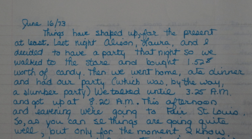 Or, in our case, just an embarrassment. I’ve been amusing myself this week reading old letters and my adolescent diary (what a bore!). Most of the diary is just angst-ridden drivel and reports on hockey scores, but there are some choice tidbits like this one from 1973, the very year I blogged about last week.