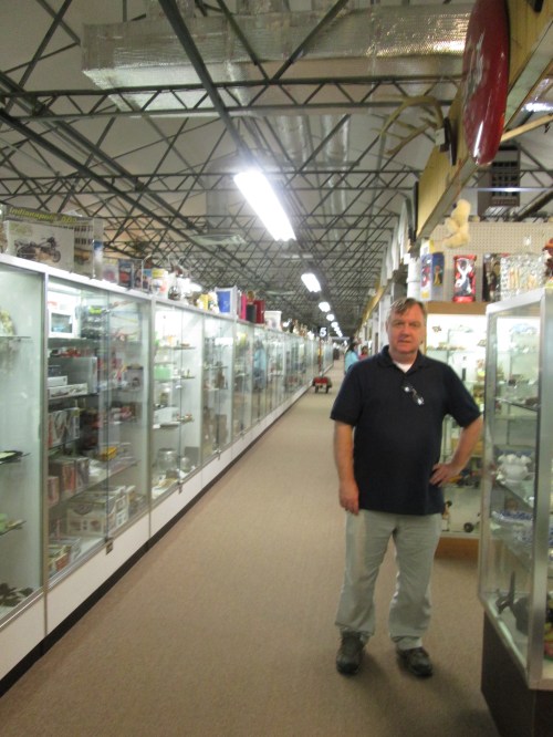 It covers 26 acres and has parking for 300 cars, tour buses, etc… Open 362 days a year, they “observe Easter, Thanksgiving, and Christmas.” They also hold auctions, offer a personal shopper service, and will ship anything you buy. This picture of the DH gives you a good idea of the size of the place. He’s standing in the corridor that runs the length of the building, from which the five wings extend.