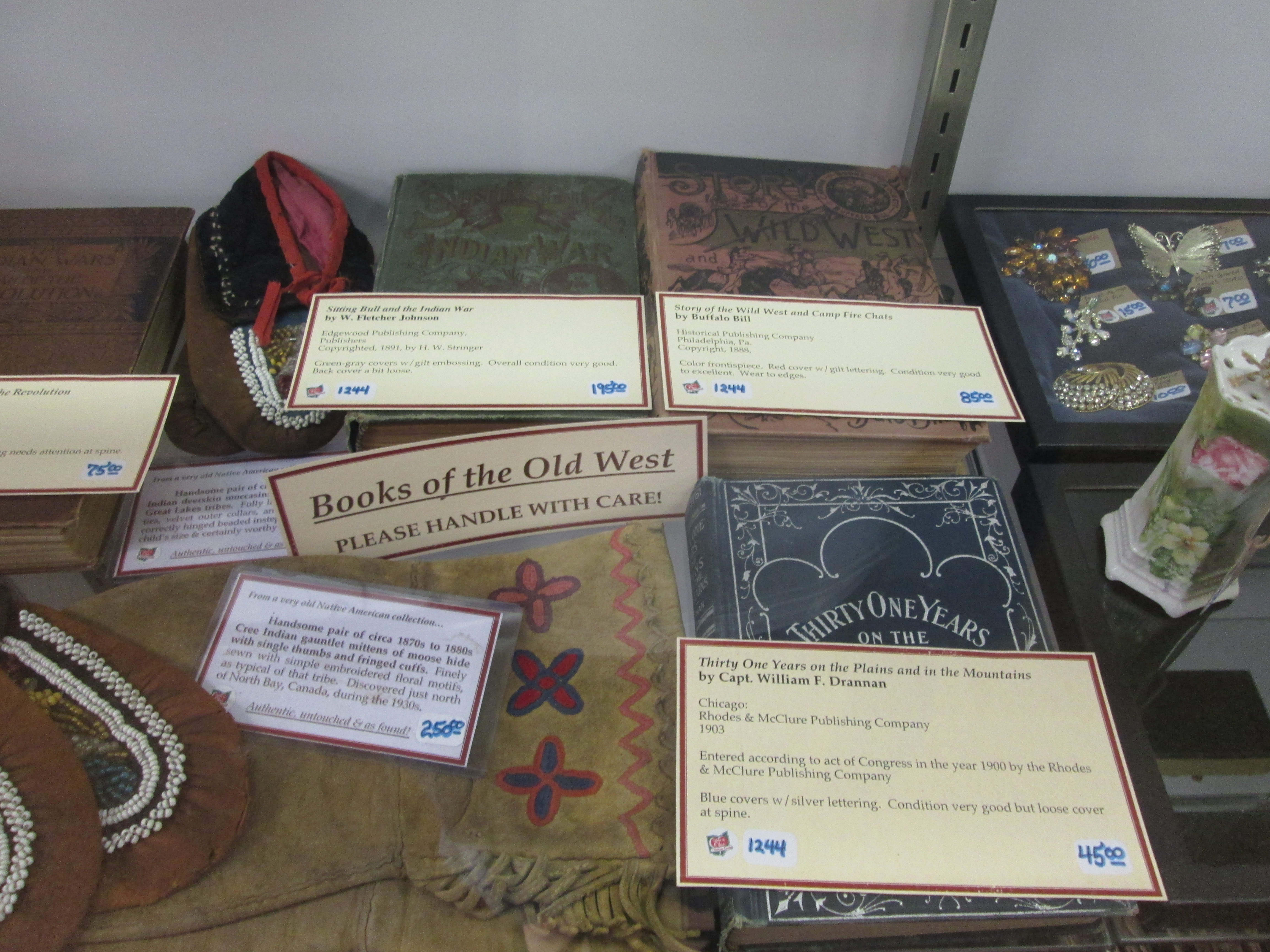 There’s something for everyone: guns and militaria; tools; china; textiles; taxidermy (everything from bison heads to moose), and books. I thought of my Dual Personality when I saw the books in this case but, alas, I did not get the chance to look at them.