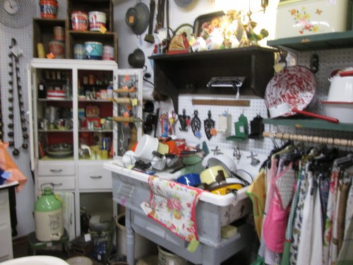 Sure, there’s a predictable amount of mid-century glassware and kitchen stuff, but it’s all well displayed — some of it cleverly, like this booth, in which the pots and pans are all piled in the sink as if waiting to be washed.