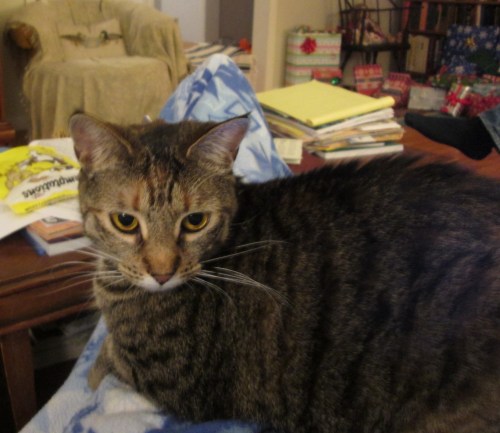 We received books, music, DVDs (including the wonderful Captain Newman, M.D. from my DP), art (again, from my DP), socks, and things less easy to categorize. We played board games, talked and talked, and ate too much chocolate. The cat entertained us with her feline combat skills. When temperatures plummeted way below zero (into the -20s), we had an excuse to stay inside. It was so much fun that I forgot to take pictures and most of the ones I did shoot turned out like this: