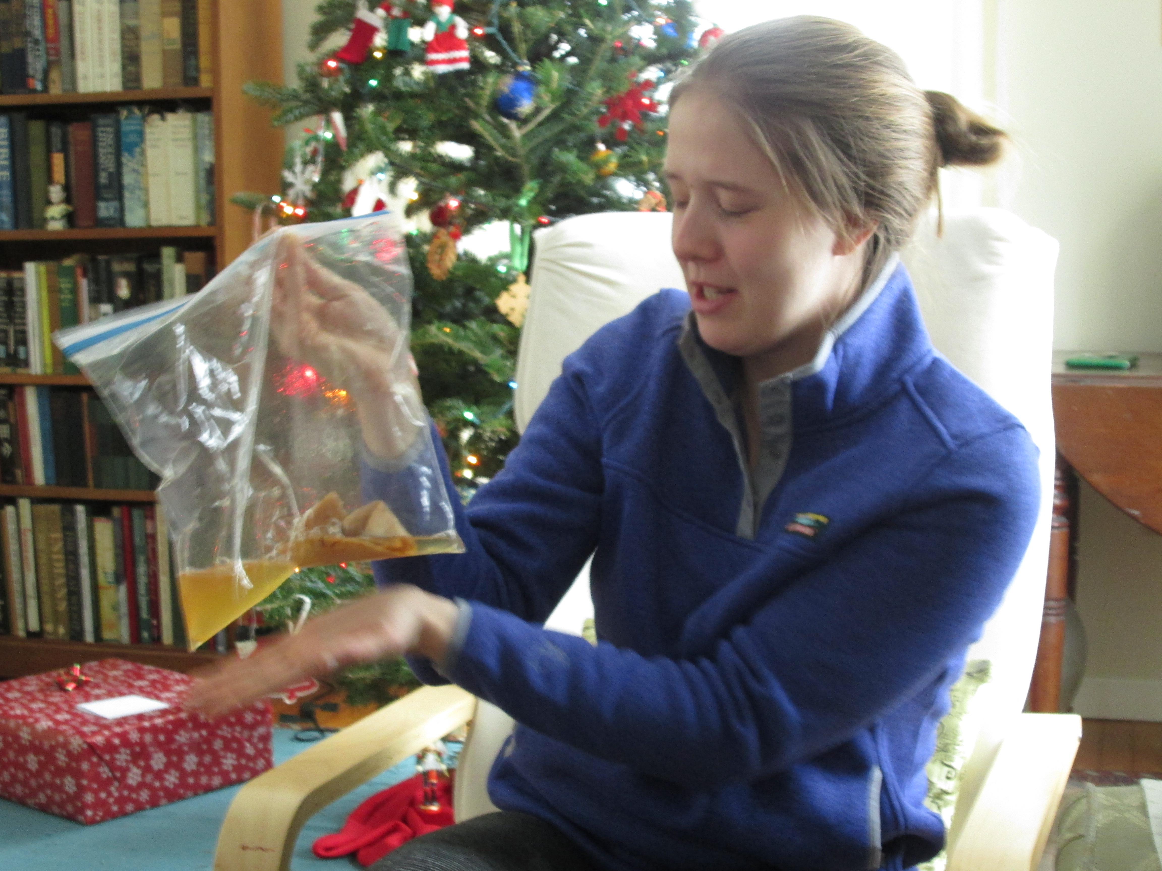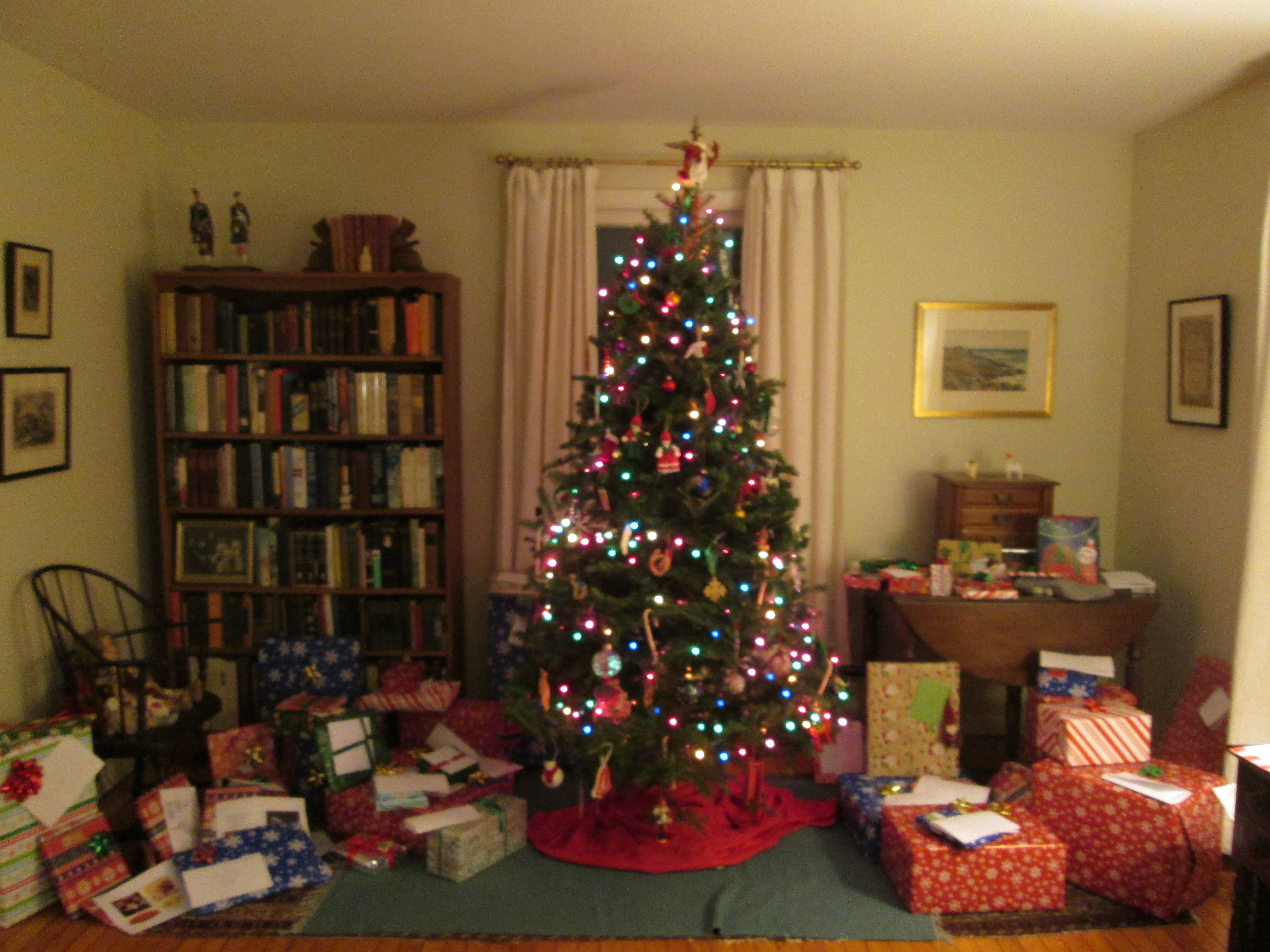 We received books, music, DVDs (including the wonderful Captain Newman, M.D. from my DP), art (again, from my DP), socks, and things less easy to categorize. We played board games, talked and talked, and ate too much chocolate. The cat entertained us with her feline combat skills. When temperatures plummeted way below zero (into the -20s), we had an excuse to stay inside. It was so much fun that I forgot to take pictures and most of the ones I did shoot turned out like this: