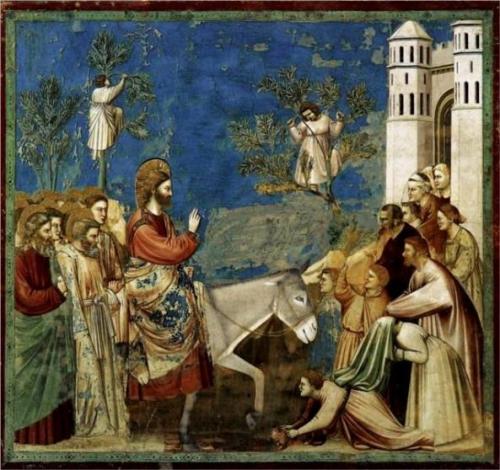 Even better is Giotto’s lively fresco, c. 1305. There’s so much to love about this painting; the sweet-faced donkey; the people climbing the trees to see better or gather palms; the lady(?) in the front right of the painting with her head covered; the man right above her with the giant sleeve, and the attempt at perspective. The colors are great, too.