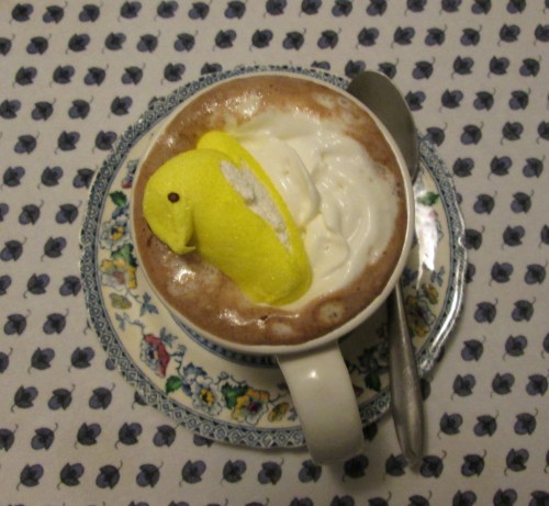 [By the way, Peeps do float. I hadn’t had one in years. They’re grossly sweet and sugary, but not in a nice, jellybean way. I can’t recommend the Peep addition to evening cocoa.]