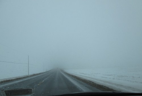 Another busy week full of dentistry (I’ll spare you that) and driving. Yesterday I took my car in for service, which is quite a production, since the dealer is about two hours away. On the way there, I drove through a weird white world of snow and fog.