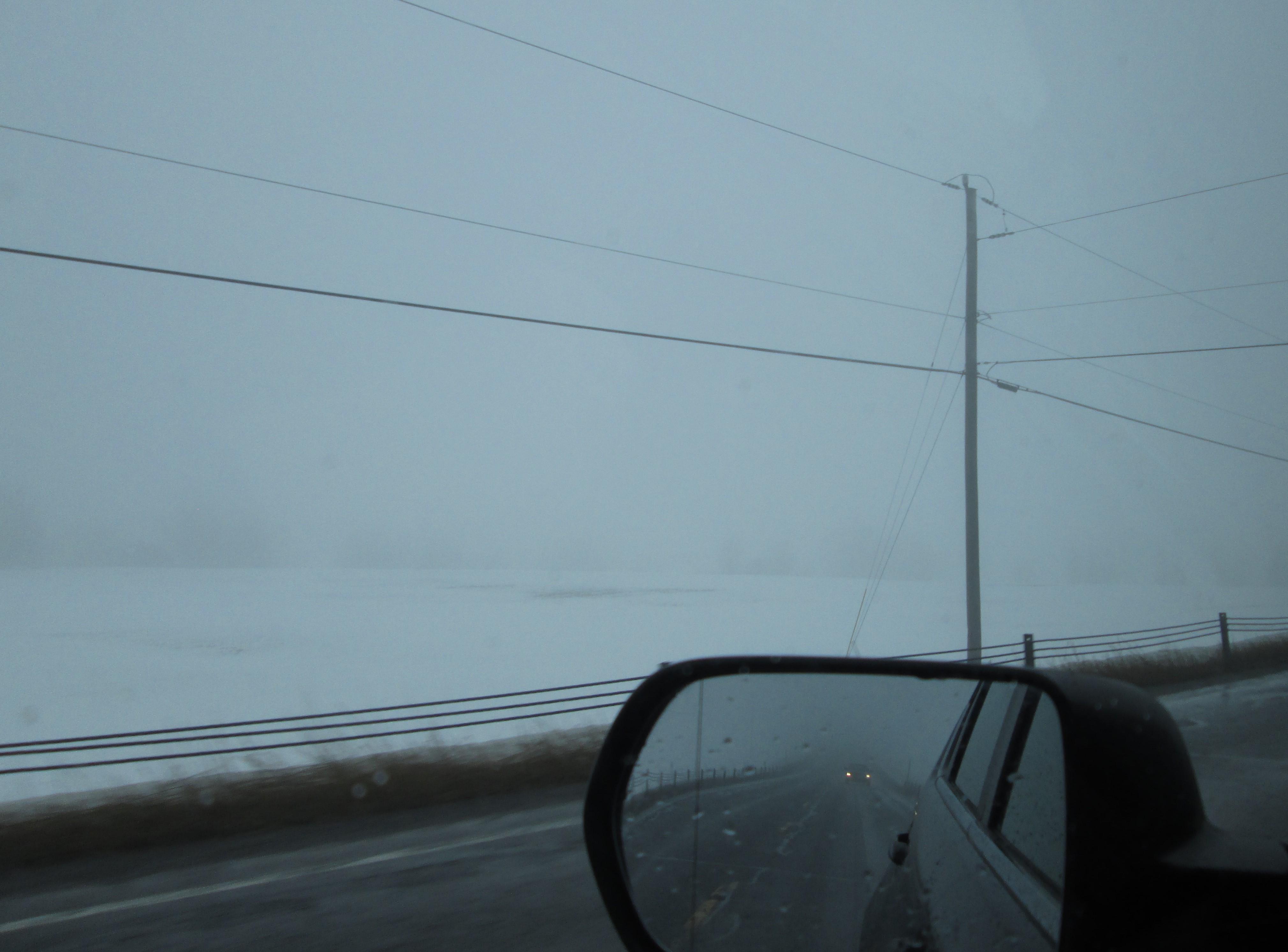 Another busy week full of dentistry (I’ll spare you that) and driving. Yesterday I took my car in for service, which is quite a production, since the dealer is about two hours away. On the way there, I drove through a weird white world of snow and fog.