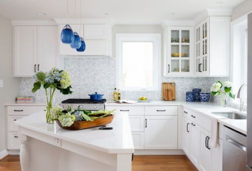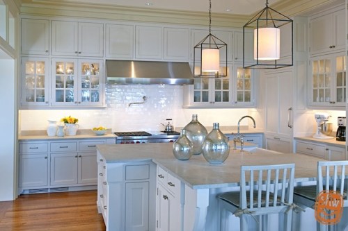 Now it gets harder. I don’t want dark counters, partly because I love my vintage white Formica and partly because the kitchen is too small for such an expanse of dark. The current plan is to update the counters to a light quartz/engineered stone. The biggest challenge involves the once excellent, now battered hardwood cabinets. We don’t want to replace them, so we plan to paint them. But should they be white?