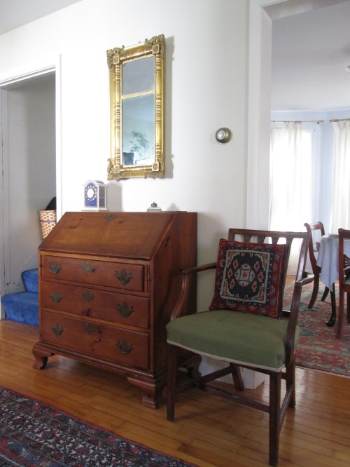 Another super busy week began with a trip to a Columbus Day antiques auction. My son accompanied me, and we had a great time watching the proceedings. Some nice antiques went for practically nothing. If only I’d been in the market for a table… However, I did manage to rescue this little Hepplewhite-style chair as a temporary addition to my living room until I get around to reupholstering the one that normally sits there.