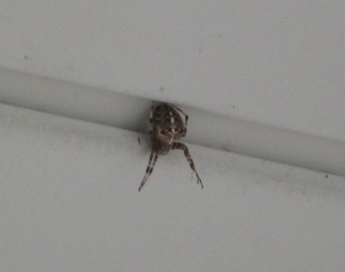 We sure are going to miss them! Once they’ve moved I’ll have to watch movies alone, and get the DH to deal with giant spiders like this one on the ceiling outside our back door. That body is about the size of a large acorn or an almond still in the shell. No kidding.
