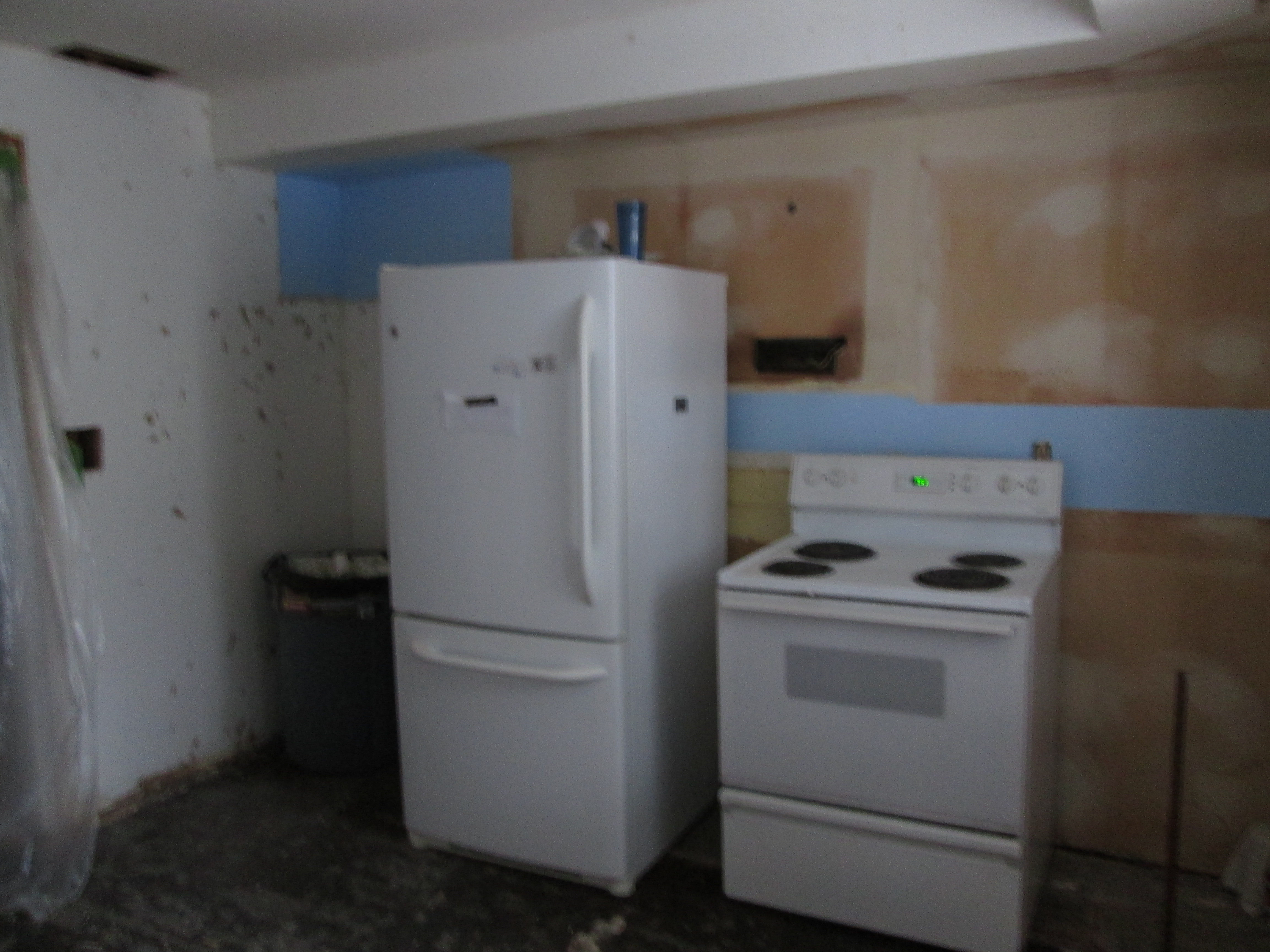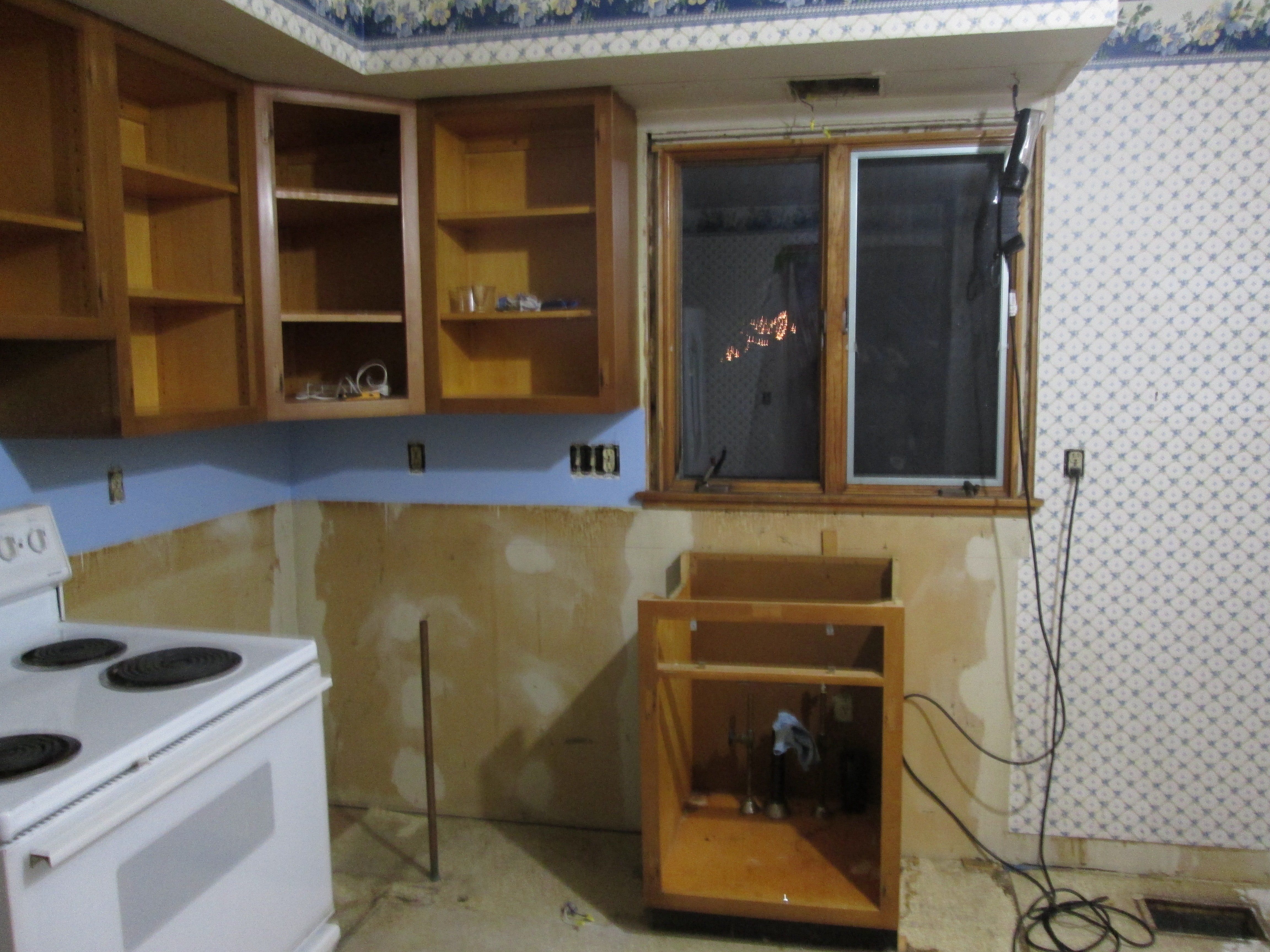 And by the end of the week, they had the room down to the bare bones: no cupboards; no sink; no dishwasher; no floor; no wallpaper, no stove vent, and no lights.